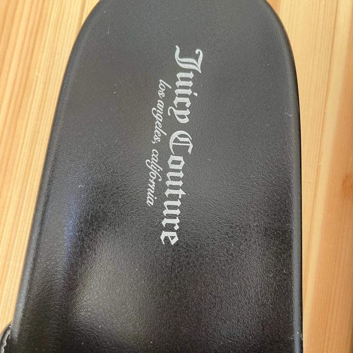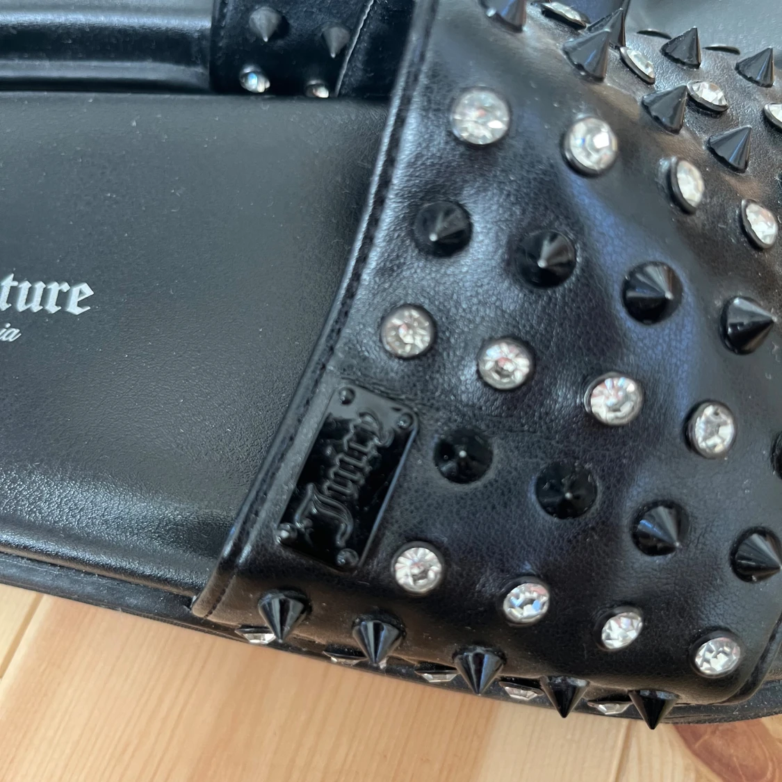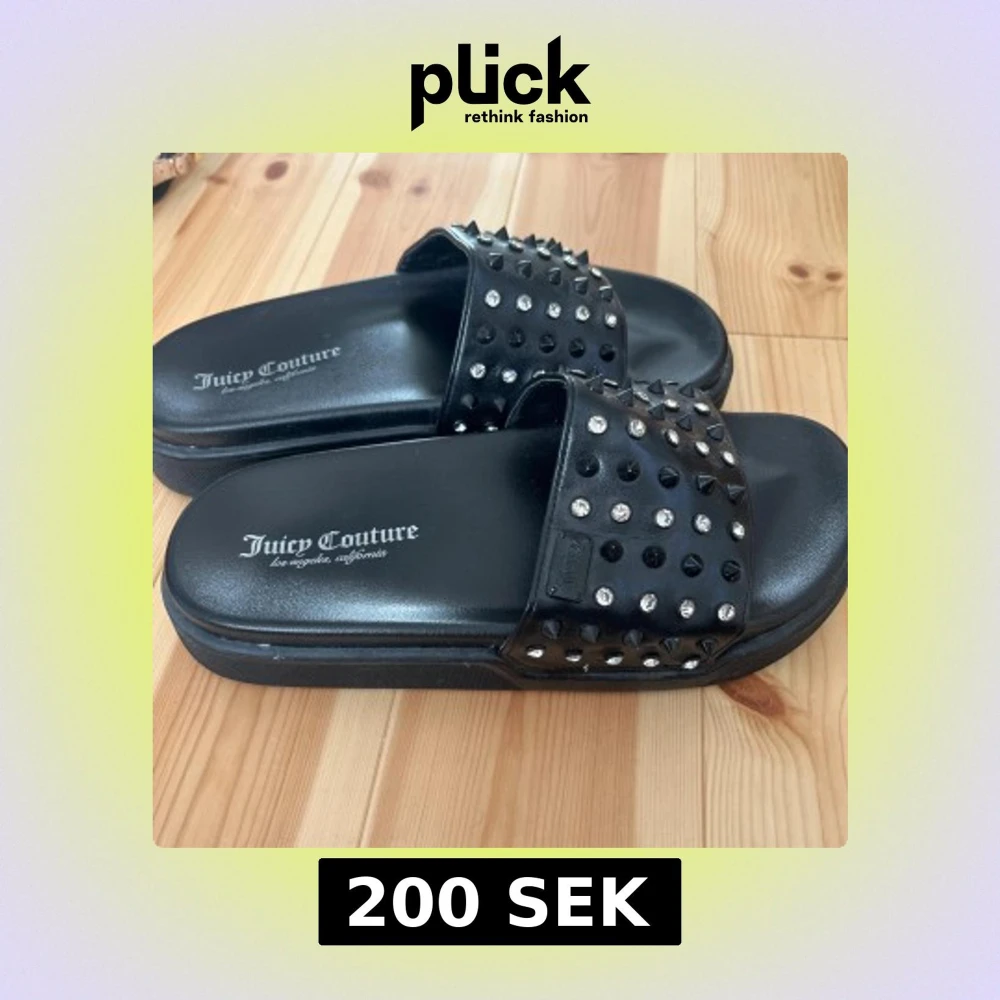 Svarta sandaler från Juicy Couture med bred rem dekorerad med svarta nitar och glittrande stenar. Snygg chunky sula och logga på fotbädden. Perfekt statement-piece för dig som gillar edgy detaljer