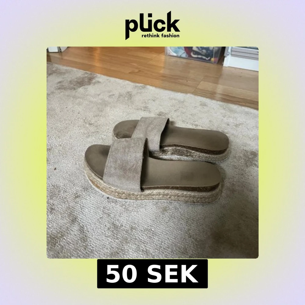 Snygga beige sandaler med bred rem i mocka och plattformsula i flätad jute.