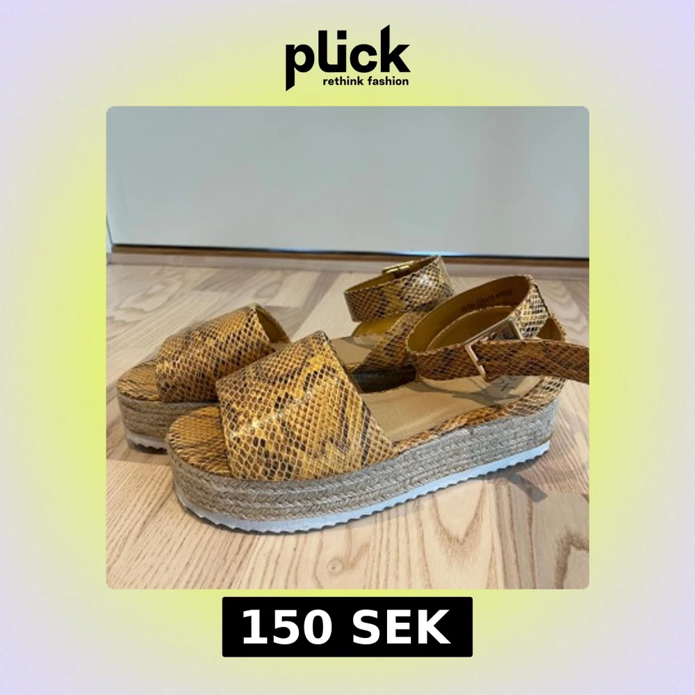 Snygga sandaler med gulbrunt ormmönster och breda remmar. Skorna har en hög platåsula med repdetaljer och vit undersida. Justerbart spänne vid ankeln för bra passform. Perfekta för sommaren! Endast använd en gång i typ 1 timme💕