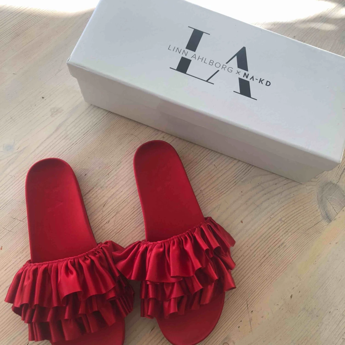 Röda sandaler i sammet med volanger från Linn Ahlborgs kollektion med NA-KD. Aldrig använda. Möts endast upp i centrala Stockholm.