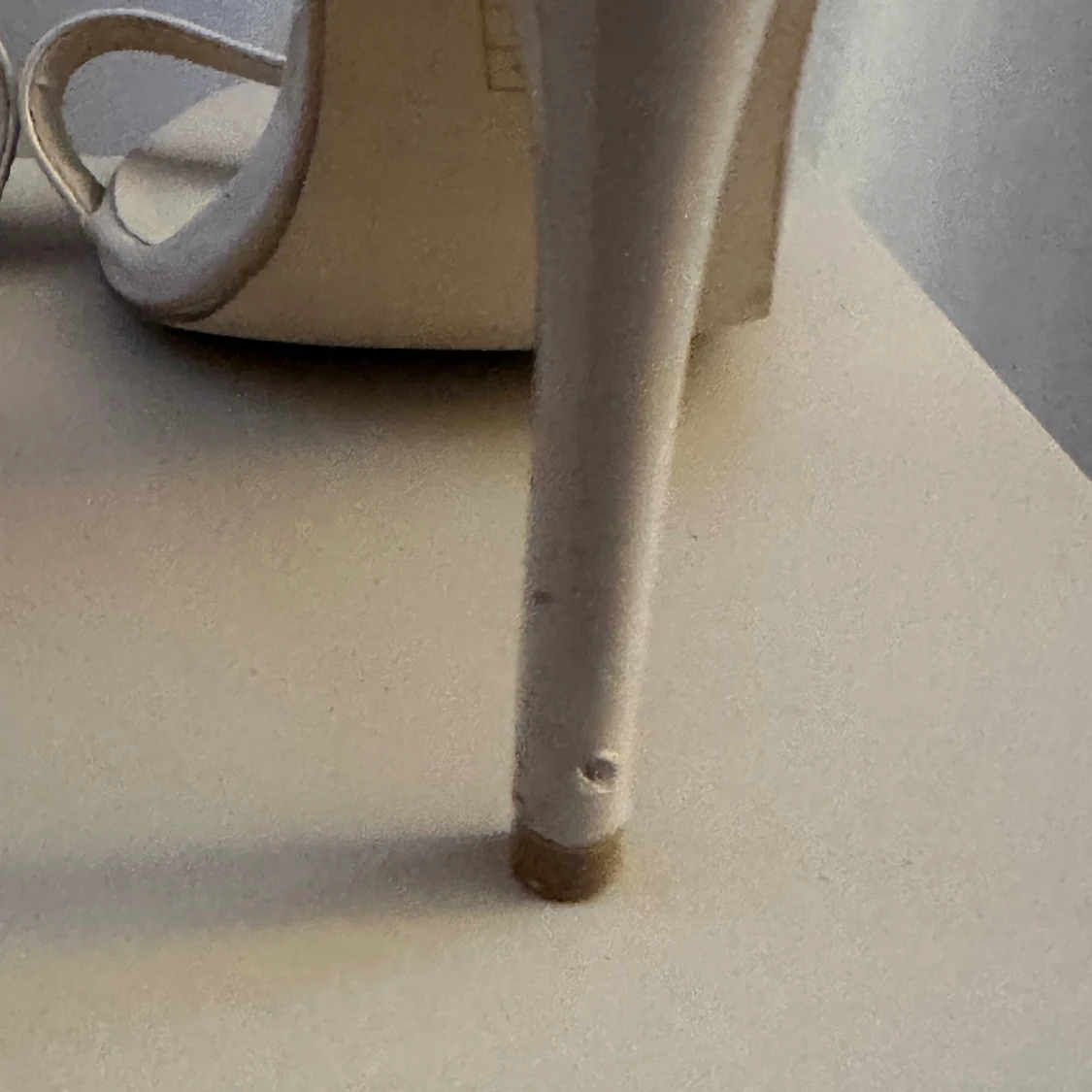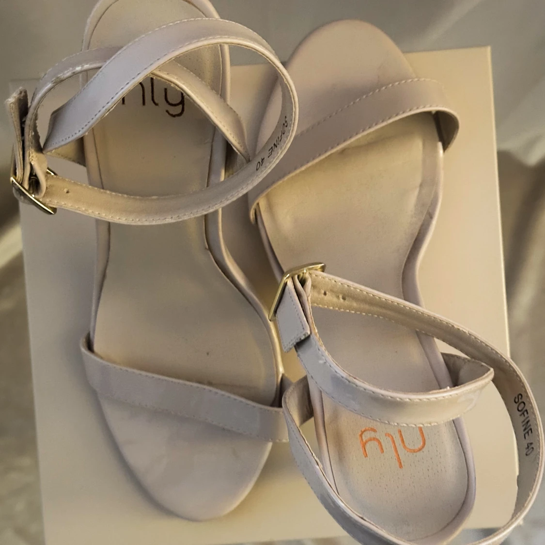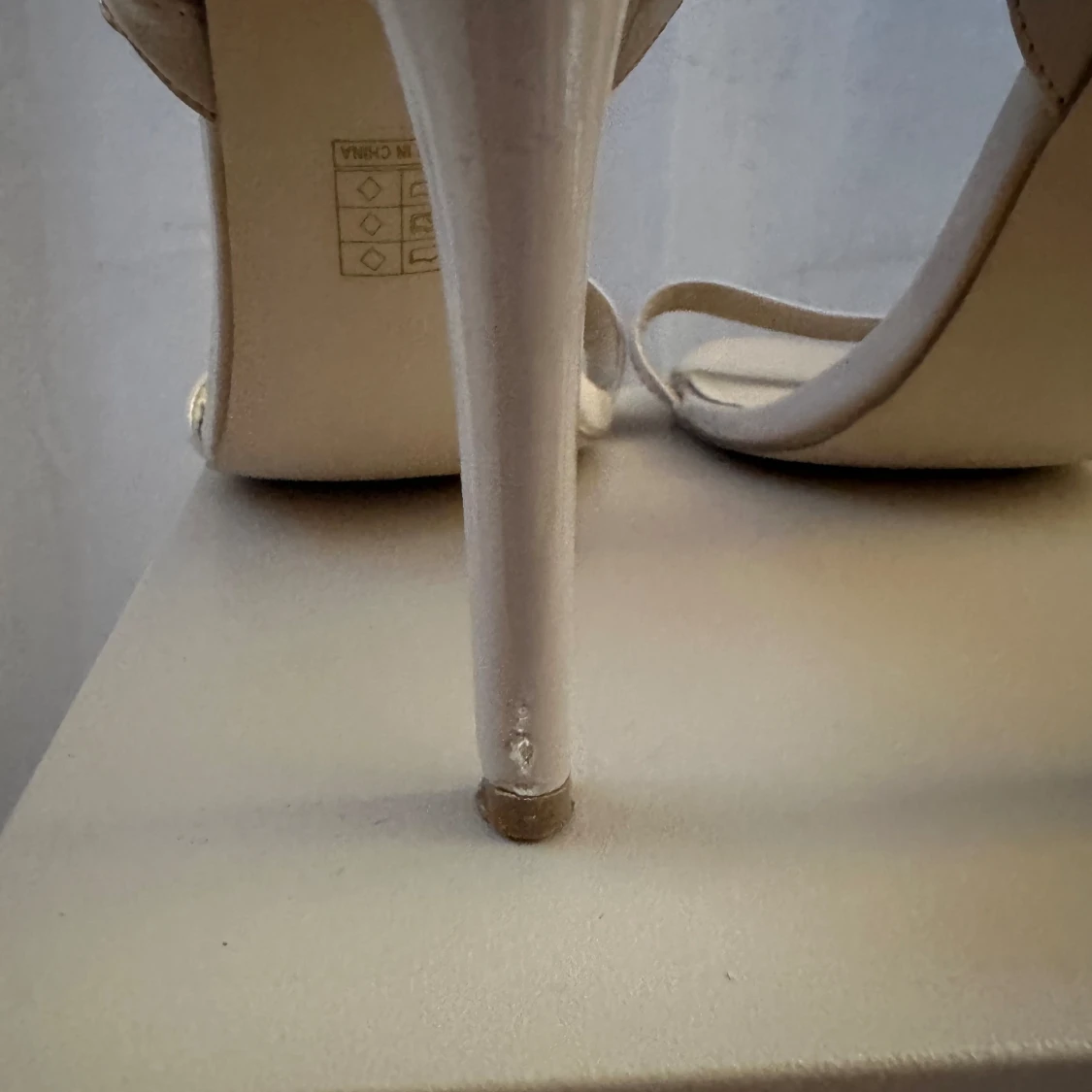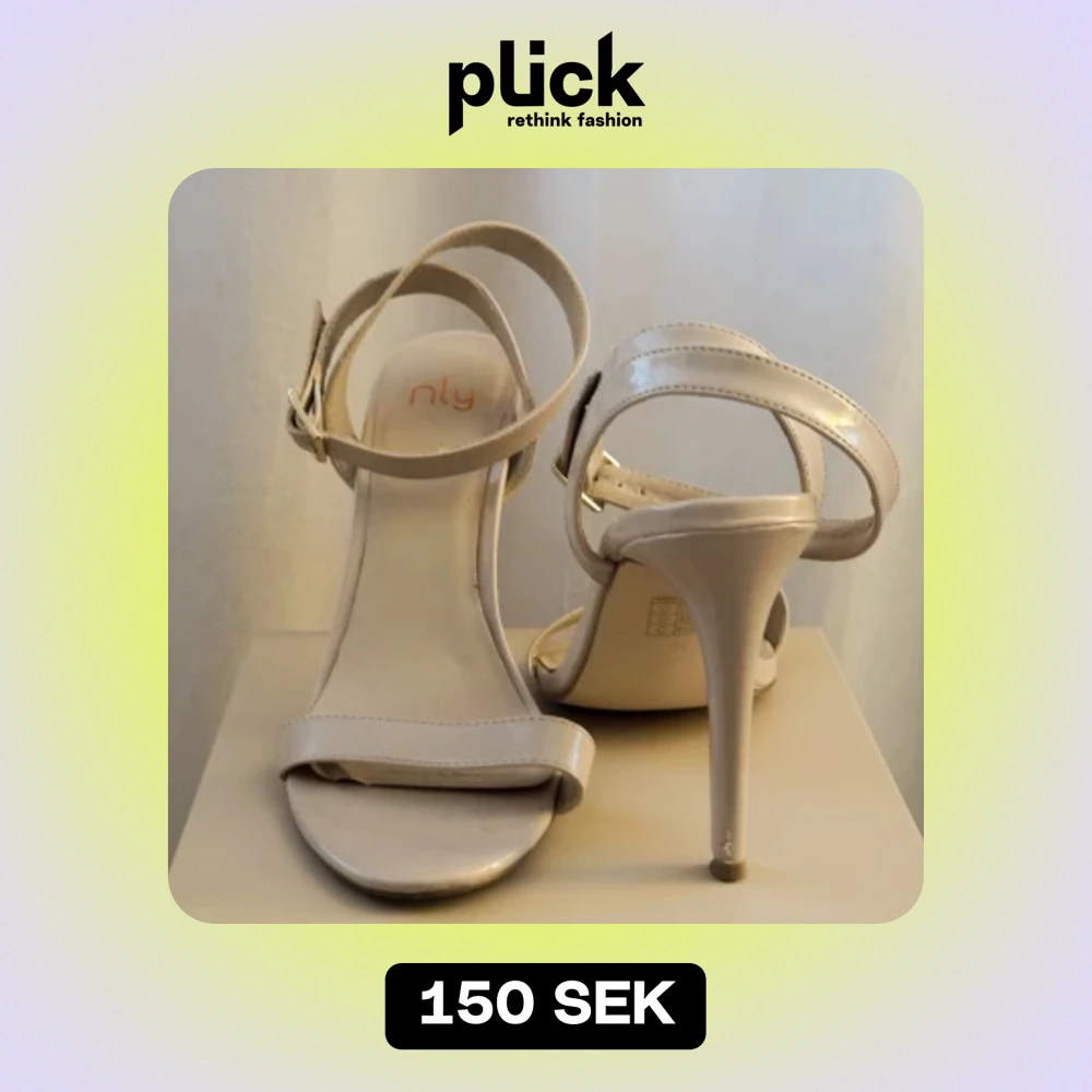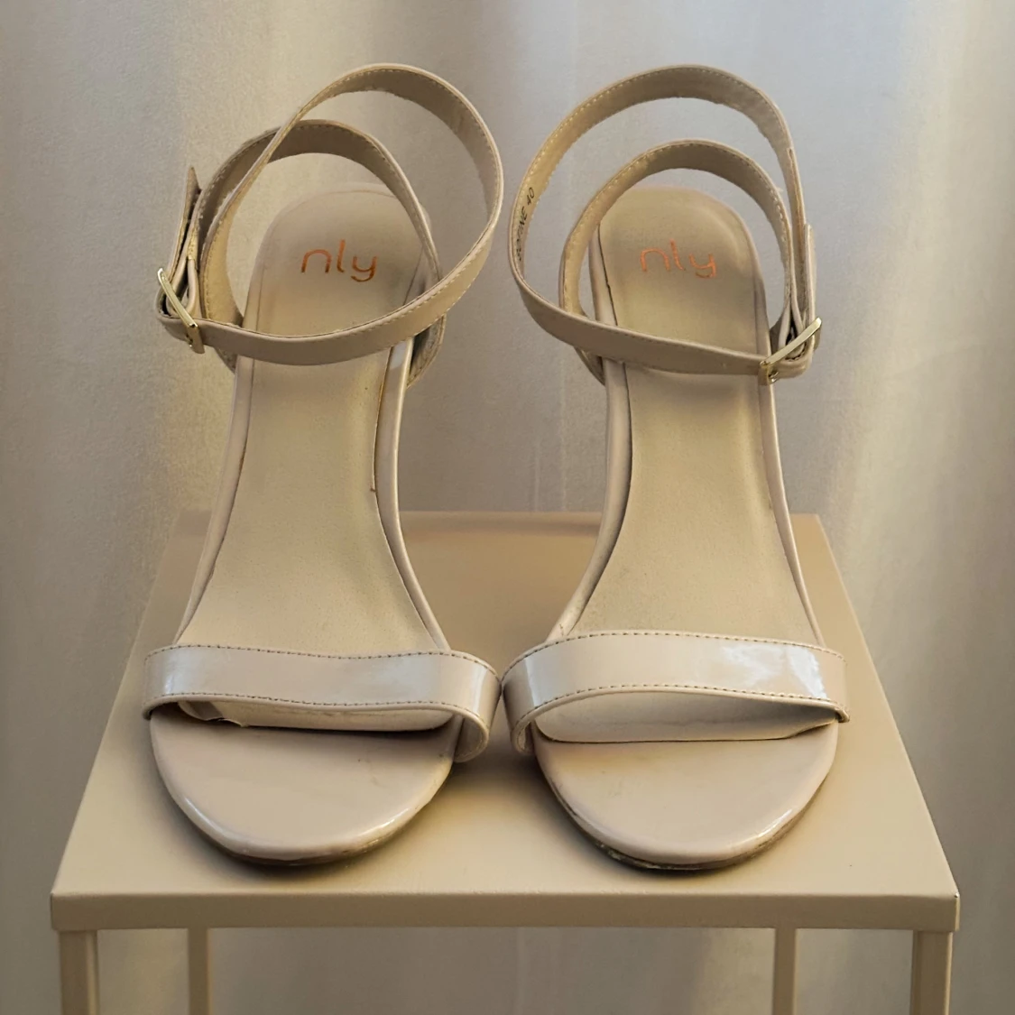 En superfin och nätt sandalett med stilett som förlänger benen super fint! Färgen är ljus lackad beige. Perfekt till studentklänningen eller sommarkvällen. Klacken är 12 cm. Se bild på slitage, sparsamt använda!