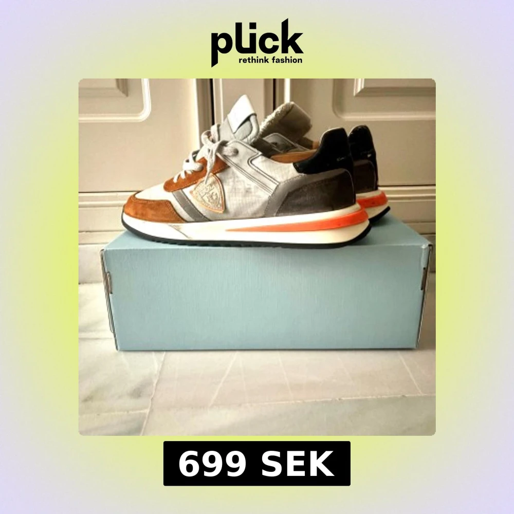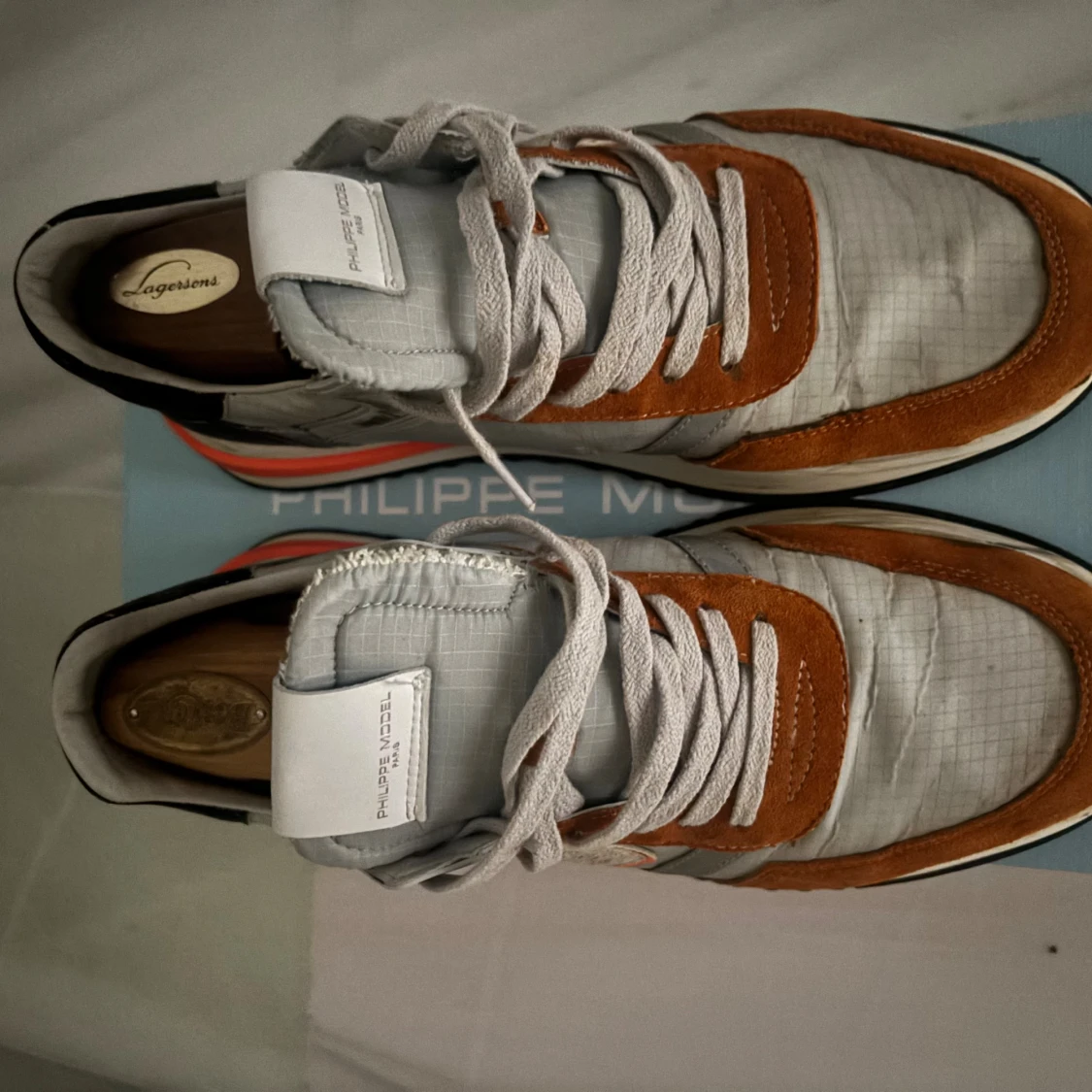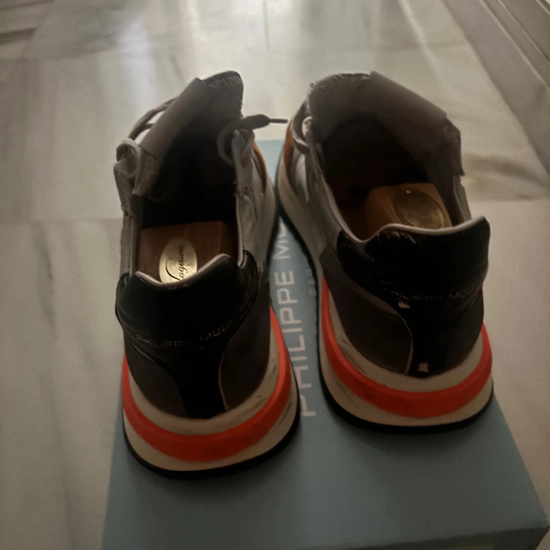 Snygga sneakers från Philippe Model i grått och orange med vita och svarta detaljer. Ovandelen är i textil och mocka med coola kontraster och logga på sidan. Skorna har snörning och en vit sula med orange rand för extra edge.
