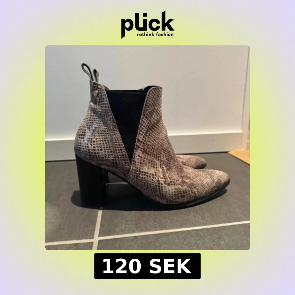 Snygga bruna stövletter med chunky klack och ormmönstrad yta. Skorna har rund tå och elastiska svarta paneler på sidorna för enkel påtagning. Perfekt för dig som vill sticka ut med coola boots i höst och vinter.