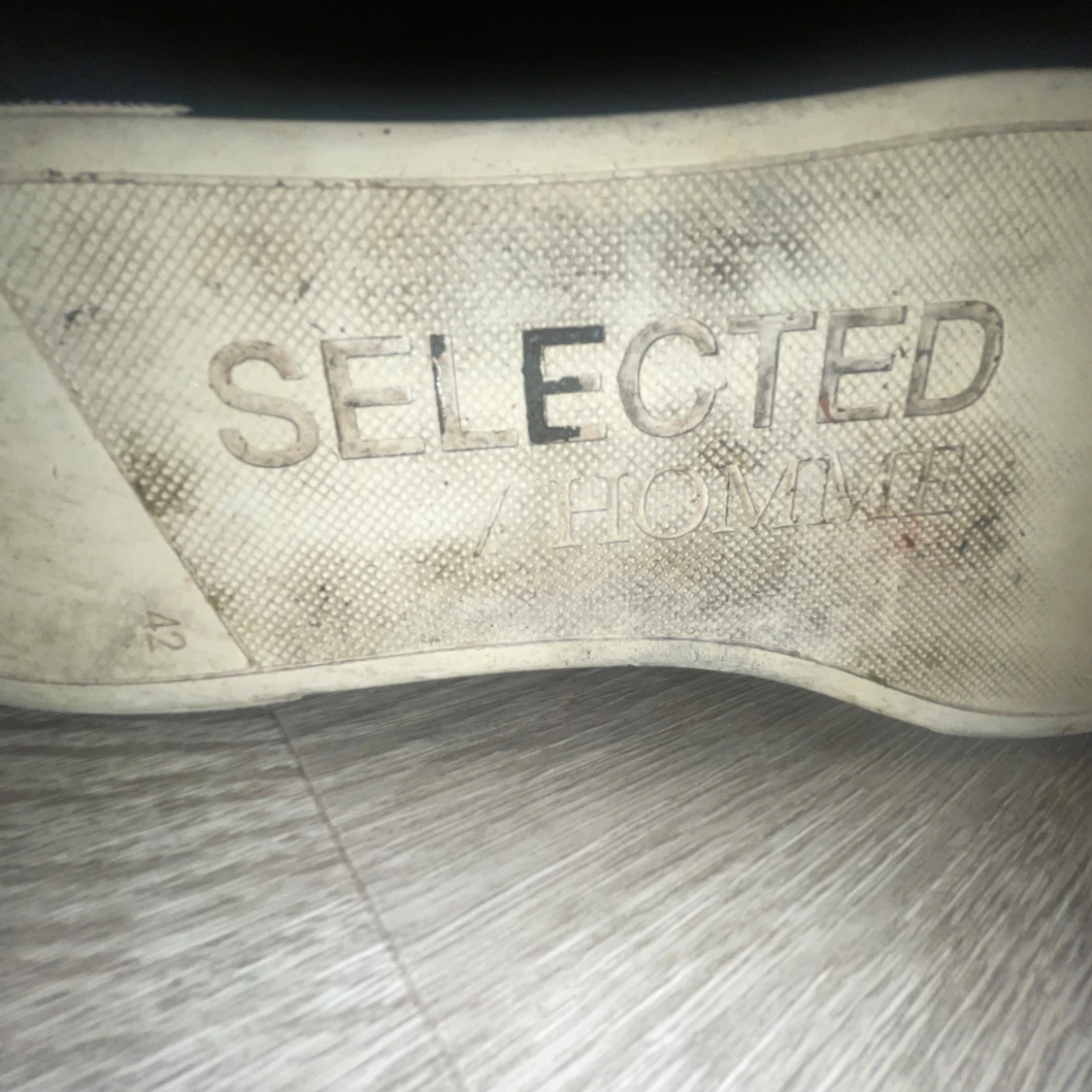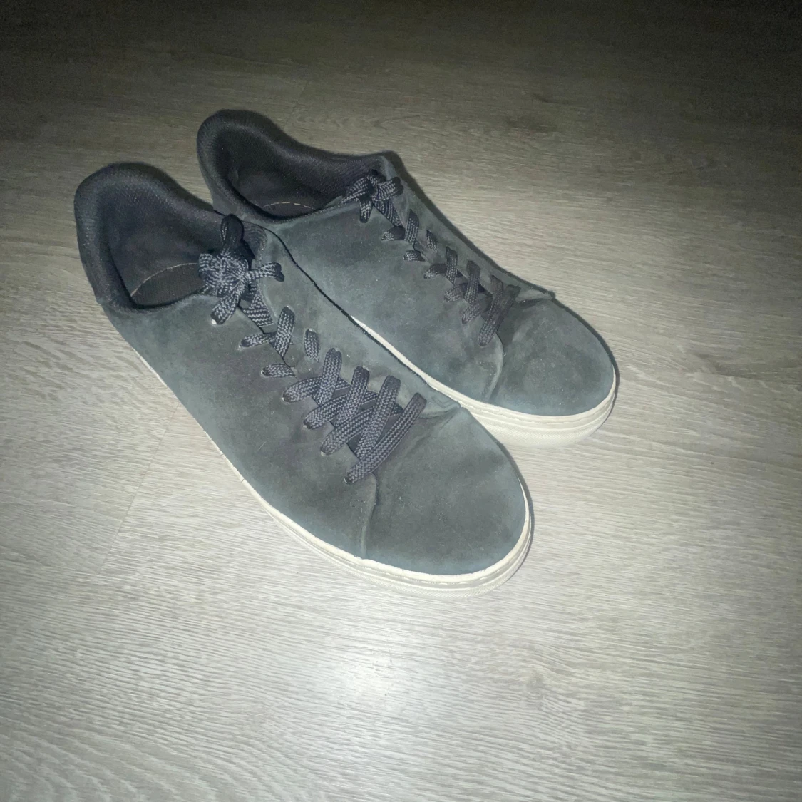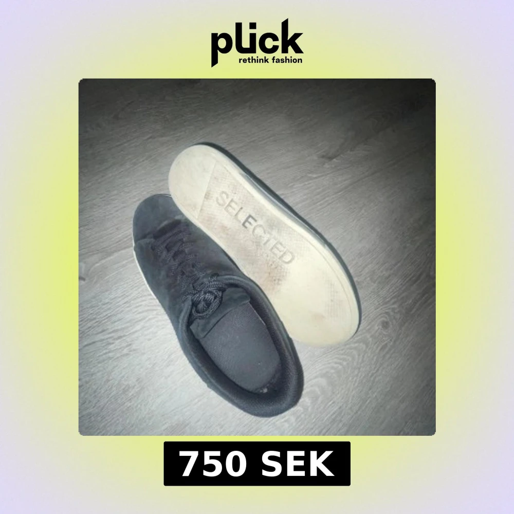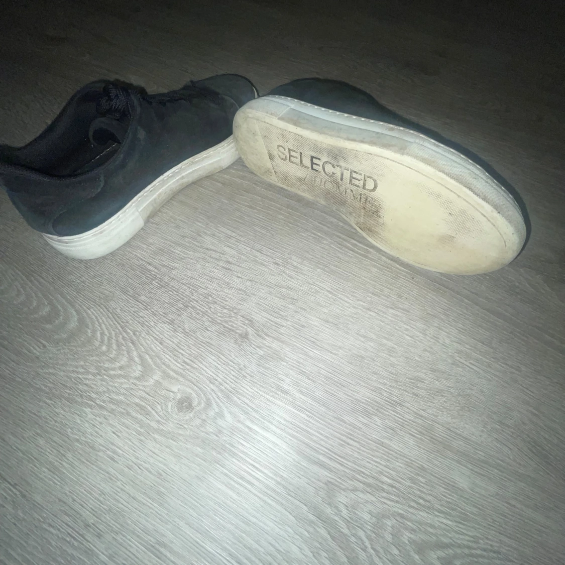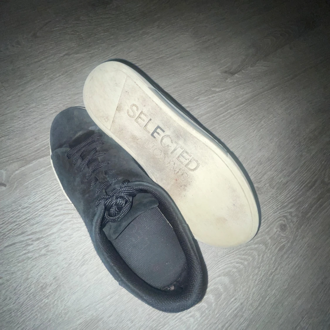 Säljer ett par svarta sneakers från Selected Homme i mocka med vita sulor och klassisk snörning. Skorna har en stilren och enkel design med rund tå och platt sula, perfekta för en clean look. Storlek 42.