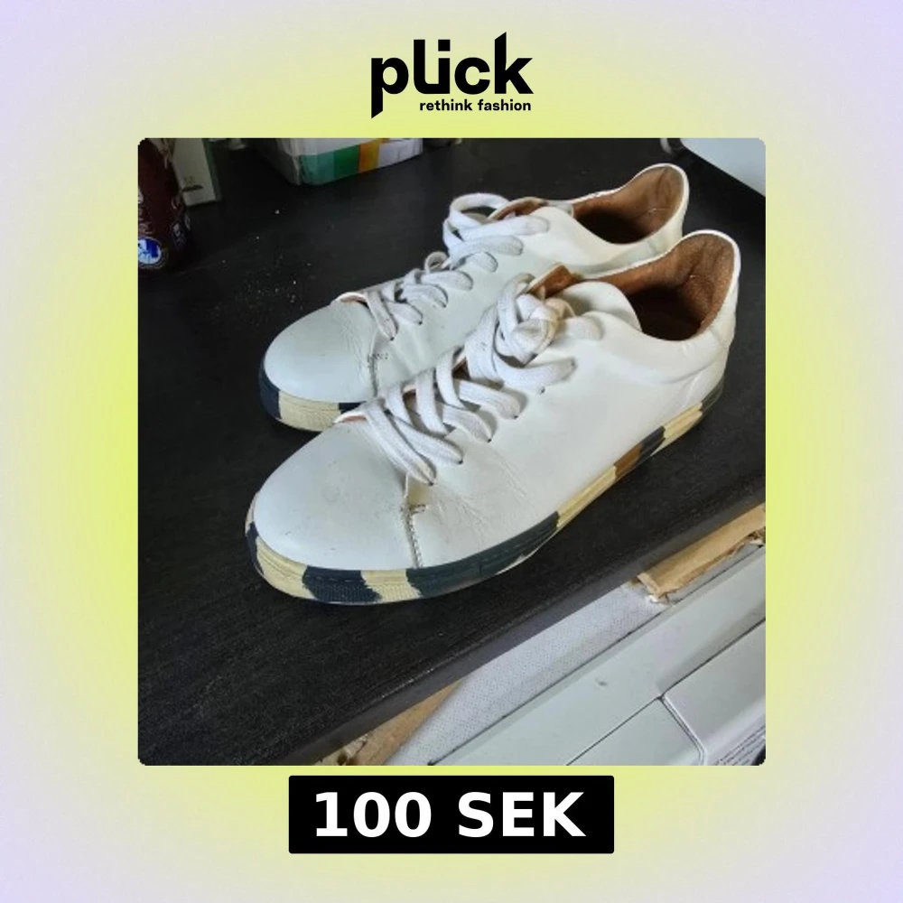 Snygga vita sneakers med snörning och cool randig sula i svart, beige och grått. Skorna har rund tå och är tillverkade i skinn med brunt innerfoder. Perfekta för dig som vill ha en stilren men unik look.