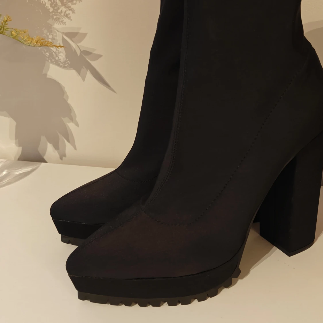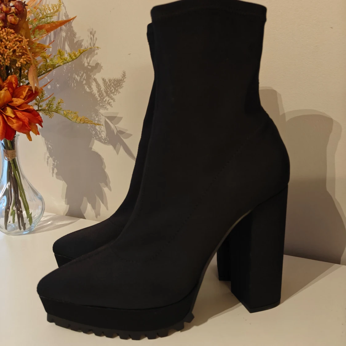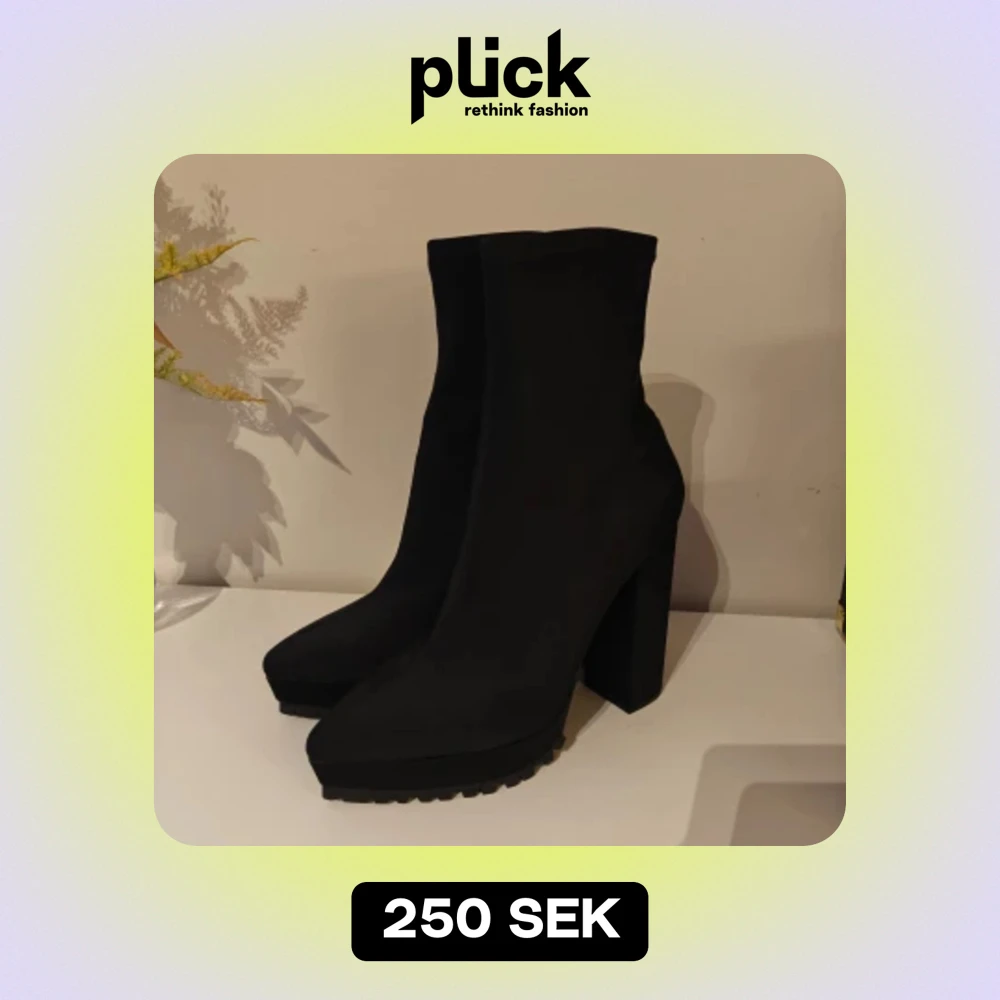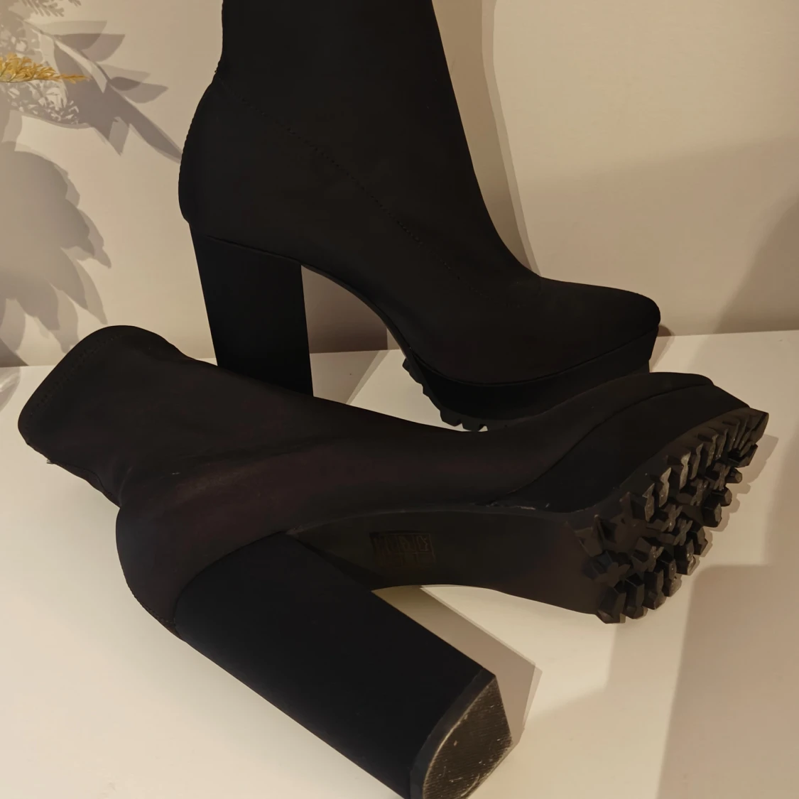 High heel neoprene boots från Nelly Aldrig använda, i toppen skick, bara testade i hemmet därav lite synlighet av användning på sulorna. Överdelen av skorna är "mjukt" och rörligt material. Material: neopren Org. pris 599kr. Säljs ej längre online