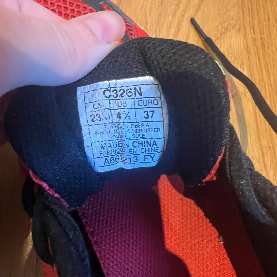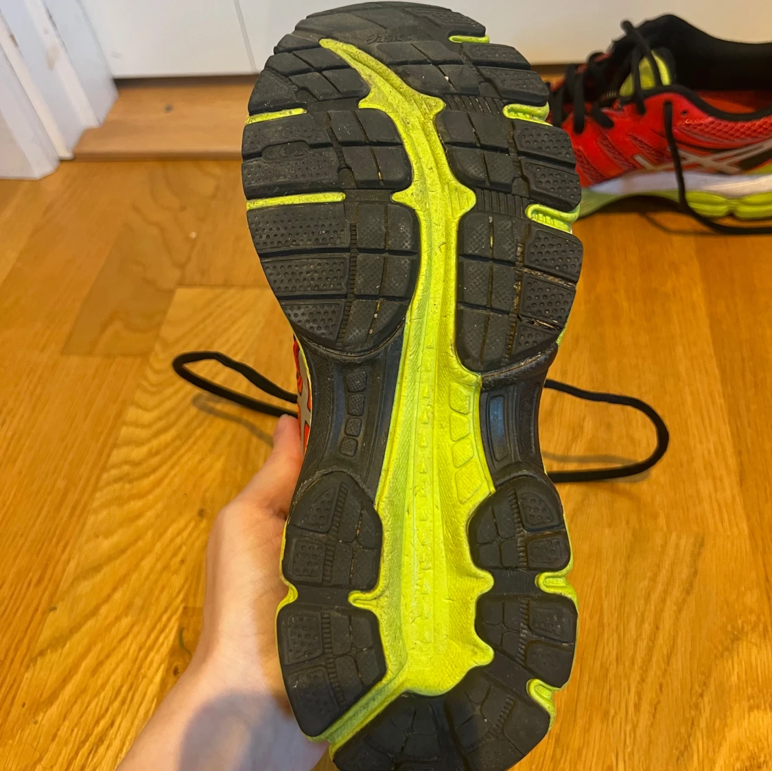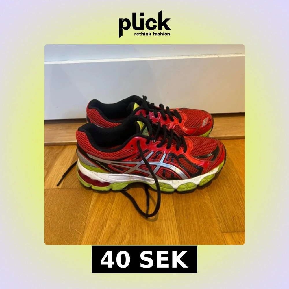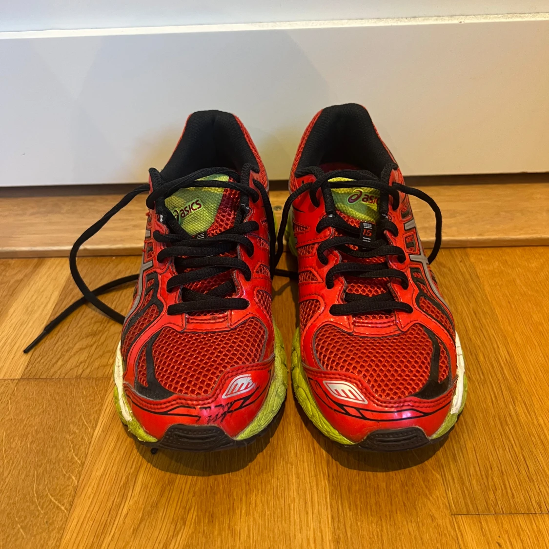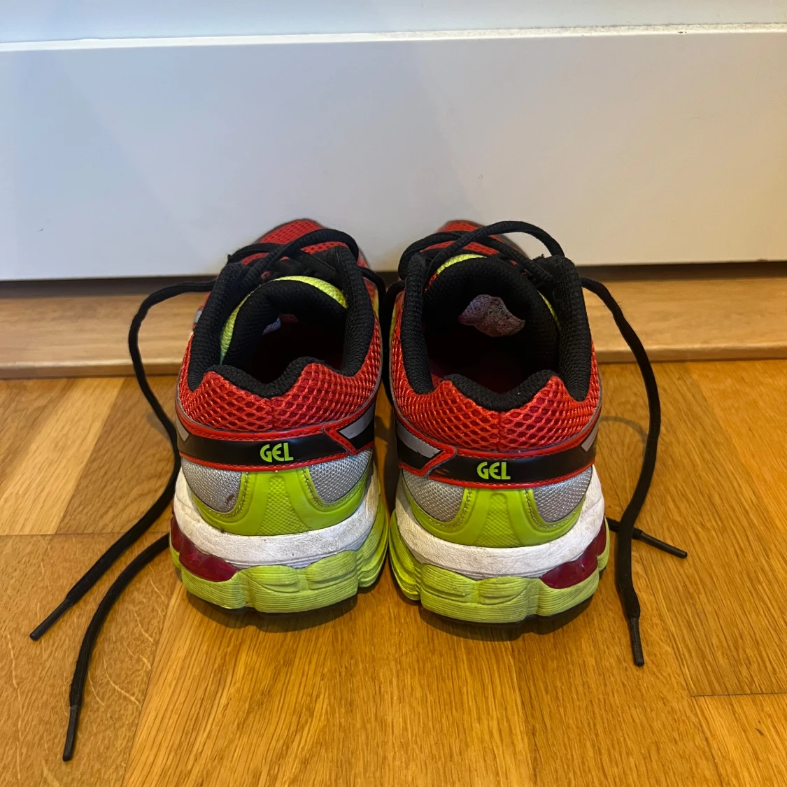 Säljer ett par röda Asics Gel sneakers med svarta och limegröna detaljer. Skorna har svart snörning, mesh-ovandel för bra andning och en dämpad sula i syntetmaterial. Storlek 37