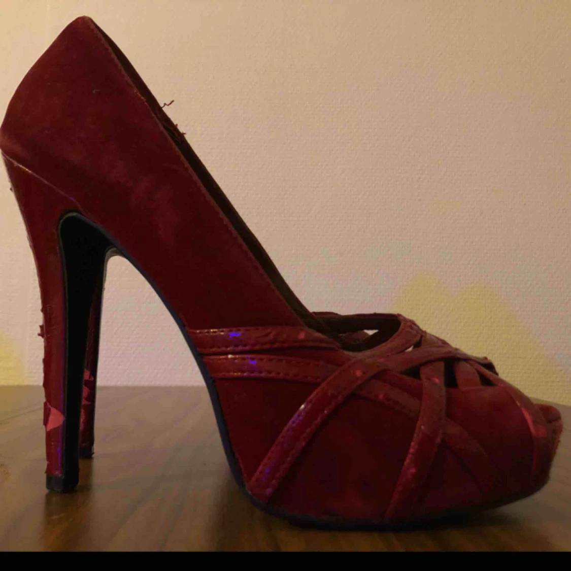 Röda klackar från Paprika. Köpta second hand, använda en gång av mig. Ganska slitna. Står ingen storlek men passar mig som har 38!