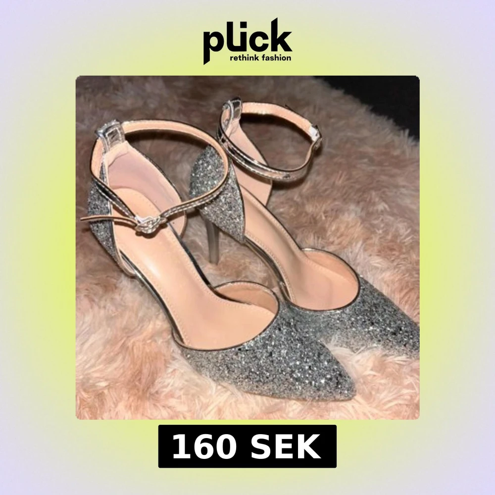 Snygga glittriga pumps i silver med spetsig tå och elegant ankelrem. Perfekta för en festlig kväll med hög klack för extra stil. Oanvända, storlek 38