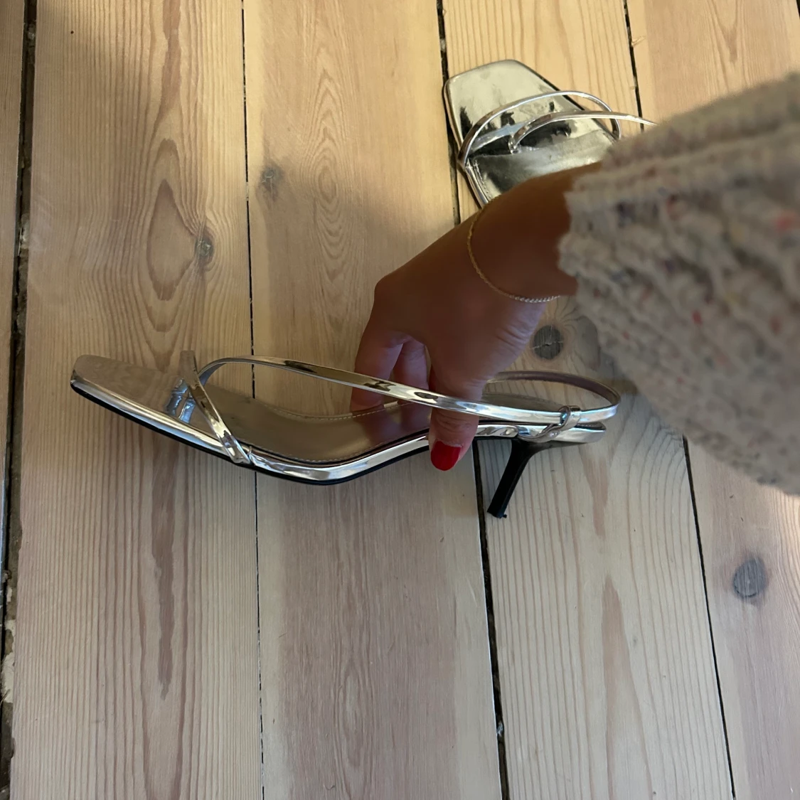 Använda 2 gånger så är som nya. Storlek 39. Köpta för 799. Silver metallic.