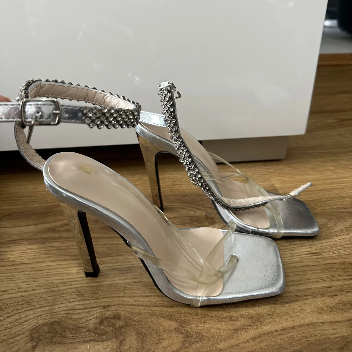 Säljer ett par silvriga klackskor med fyrkantig tå och transparenta remmar. Skorna har en hög klack och remmen runt ankeln är dekorerad med strass för extra bling. Perfekta för dig som vill sticka ut. De är oanvända storlek 36
