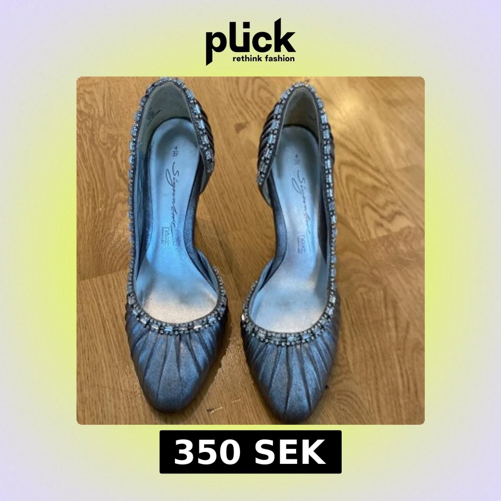 Eleganta silvriga pumps från next signature med glittrande kristaller längs kanten. Skorna har en rund tå och en smal klack som ger en sofistikerad look. Perfekta för speciella tillfällen.