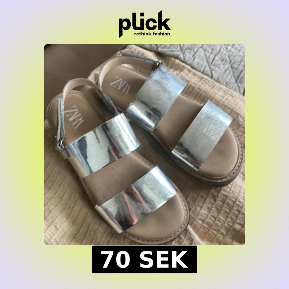 Glansiga sandaler från Zara i metallic silver med breda remmar och kardborreband runt hälen. Snygg platt sula med svart glitterdetalj på sidan. Perfekta för att sticka ut i sommarens alla looks. Det är bara att torka av dom för att de ska se helt nya ut