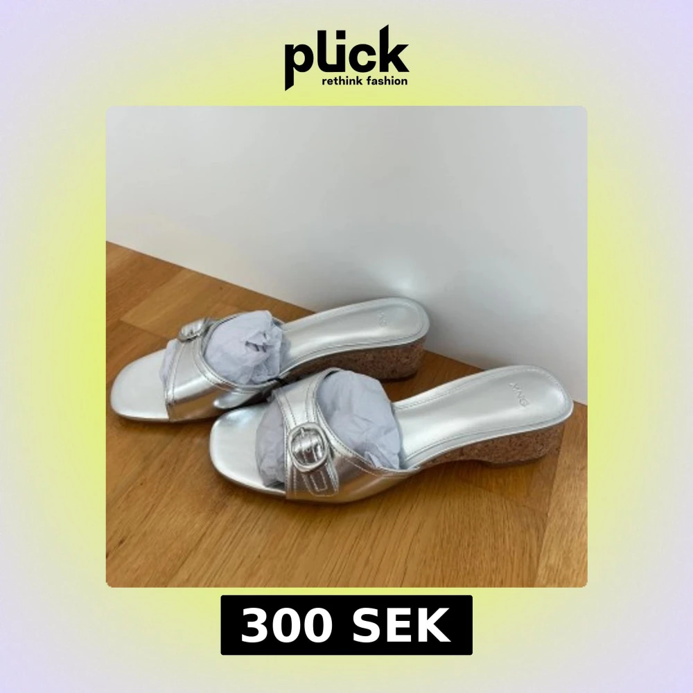 Glänsande silvriga sandaler från MNG med öppen tå, fyrkantig front och snygg spänndetalj. Skorna har en bekväm korkklack och bred rem i syntetmaterial. Perfekta för att lyfta din sommarstil med en touch av metallic. Helt nya och aldrig använda.