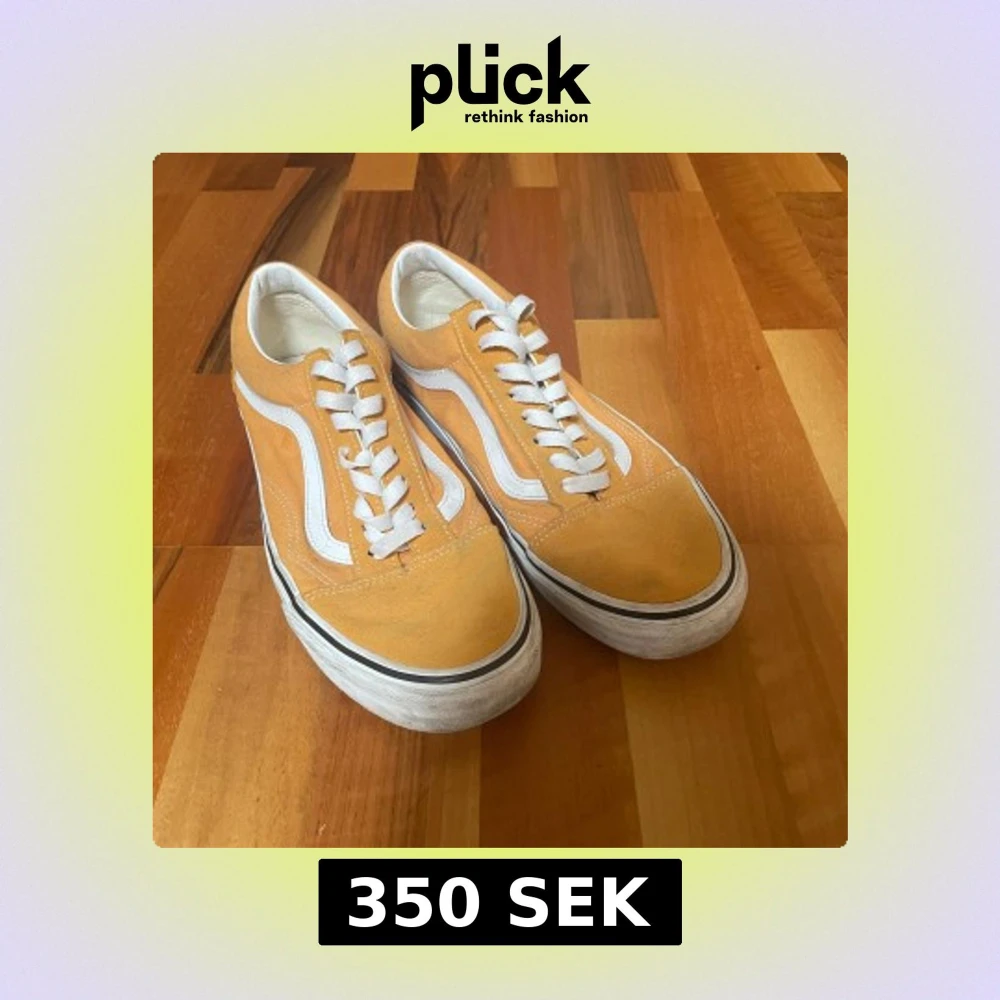 Snygga Vans Old Skool sneakers i gul och vit med klassisk vågig sidodetalj. Skorna har vit snörning, platt sula och är tillverkade i canvas och mocka. Använda några gånger, och är därmed missfärgade på sidorna.