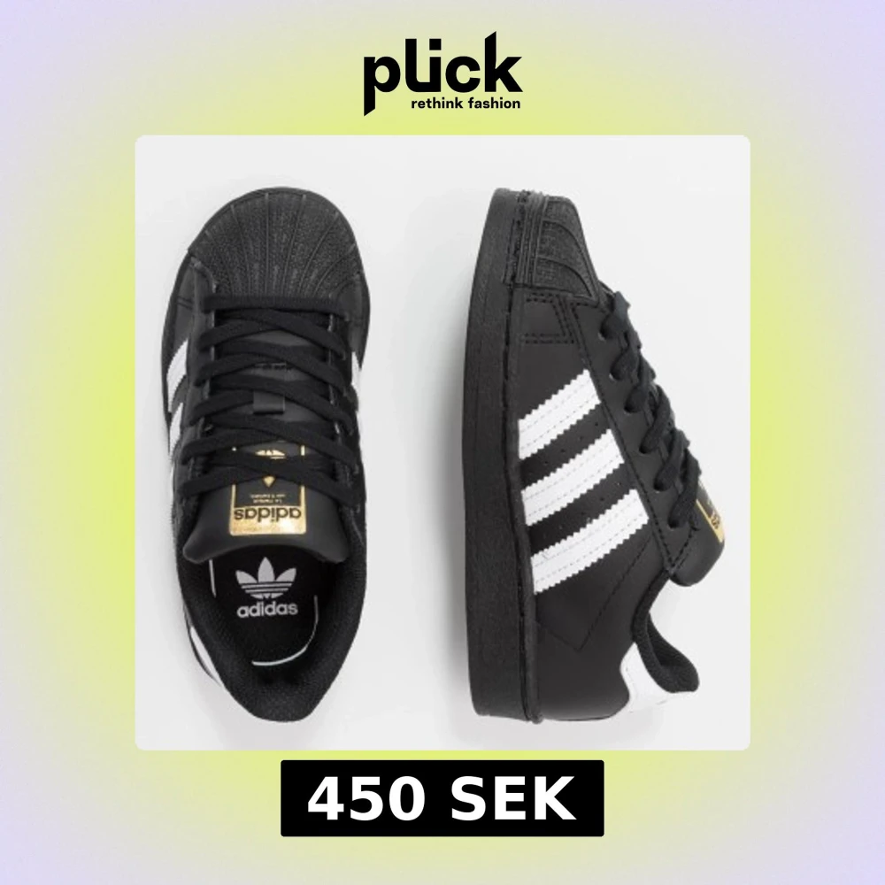 Klassiska Adidas Superstar sneakers i svart med vita ränder och gulddetaljer på plösen. Skorna har snörning, rund tå och platt sula. Knappt använda, som nya. Storlek 38!