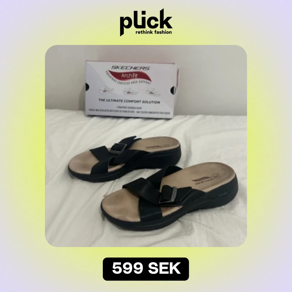 Skechers go walk arch fit BBK svarta sandaler i fint skick (kommer med förpackningen), storlek 37, skor som köptes och låg bara kvar i hyllan, originalpris 1000 kr, mitt pris kan diskuteras!😊