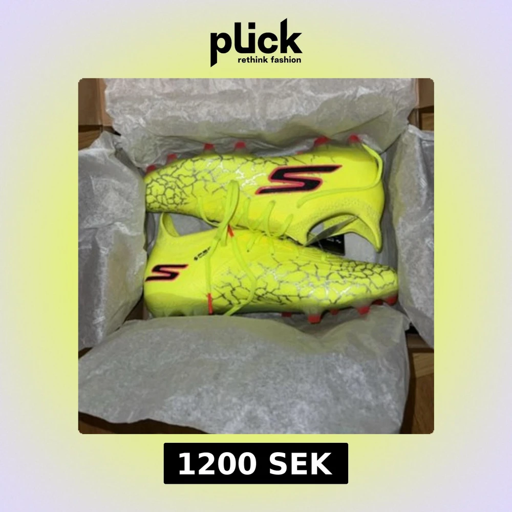 Snygga gula fotbollsskor från Skechers med ett unikt sprickmönster i silver och röda detaljer. Skorna har snörning och är designade för optimal prestanda på planen.