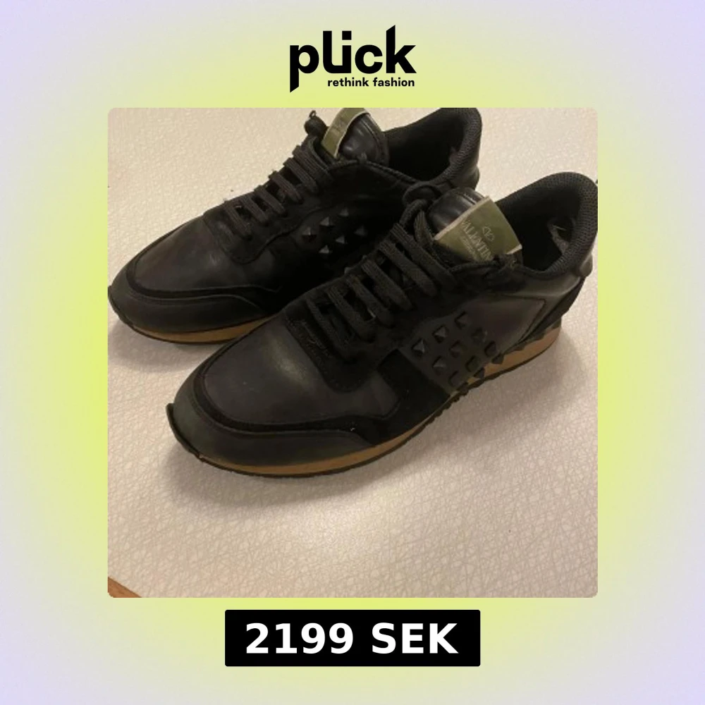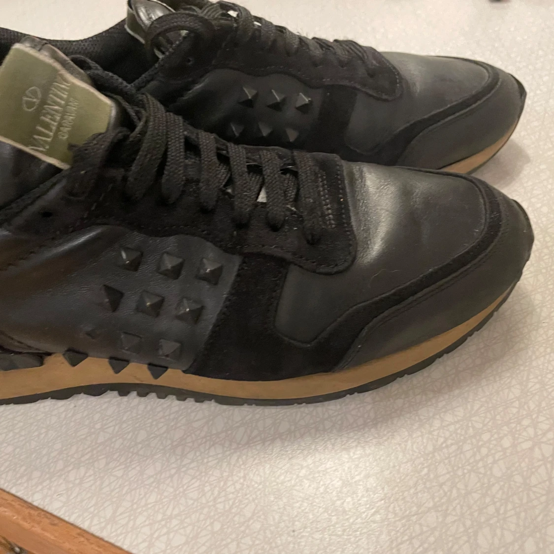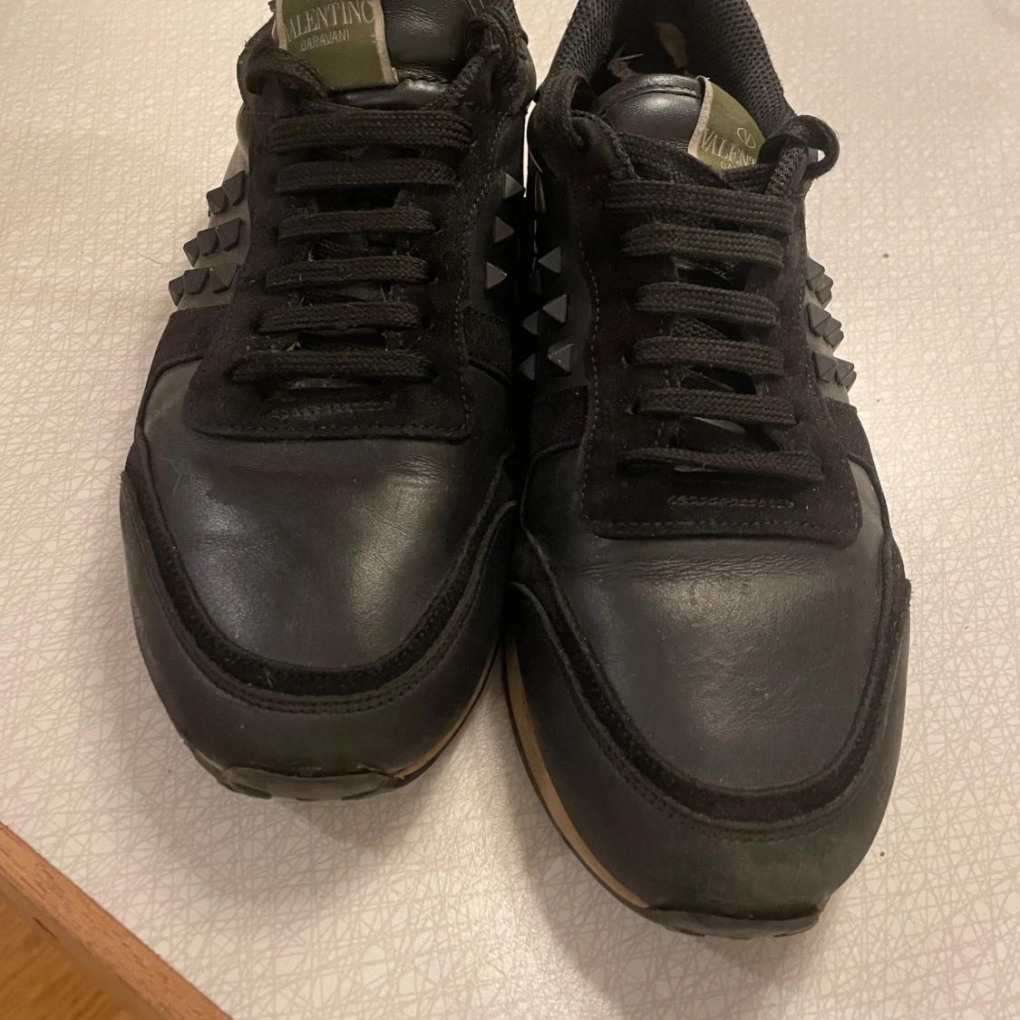 Snygga svarta sneakers från Valentino med ikoniska nitar på sidorna. Skorna har en klassisk snörning och en bekväm sula i kontrasterande färg. Perfekta för en stilren look.