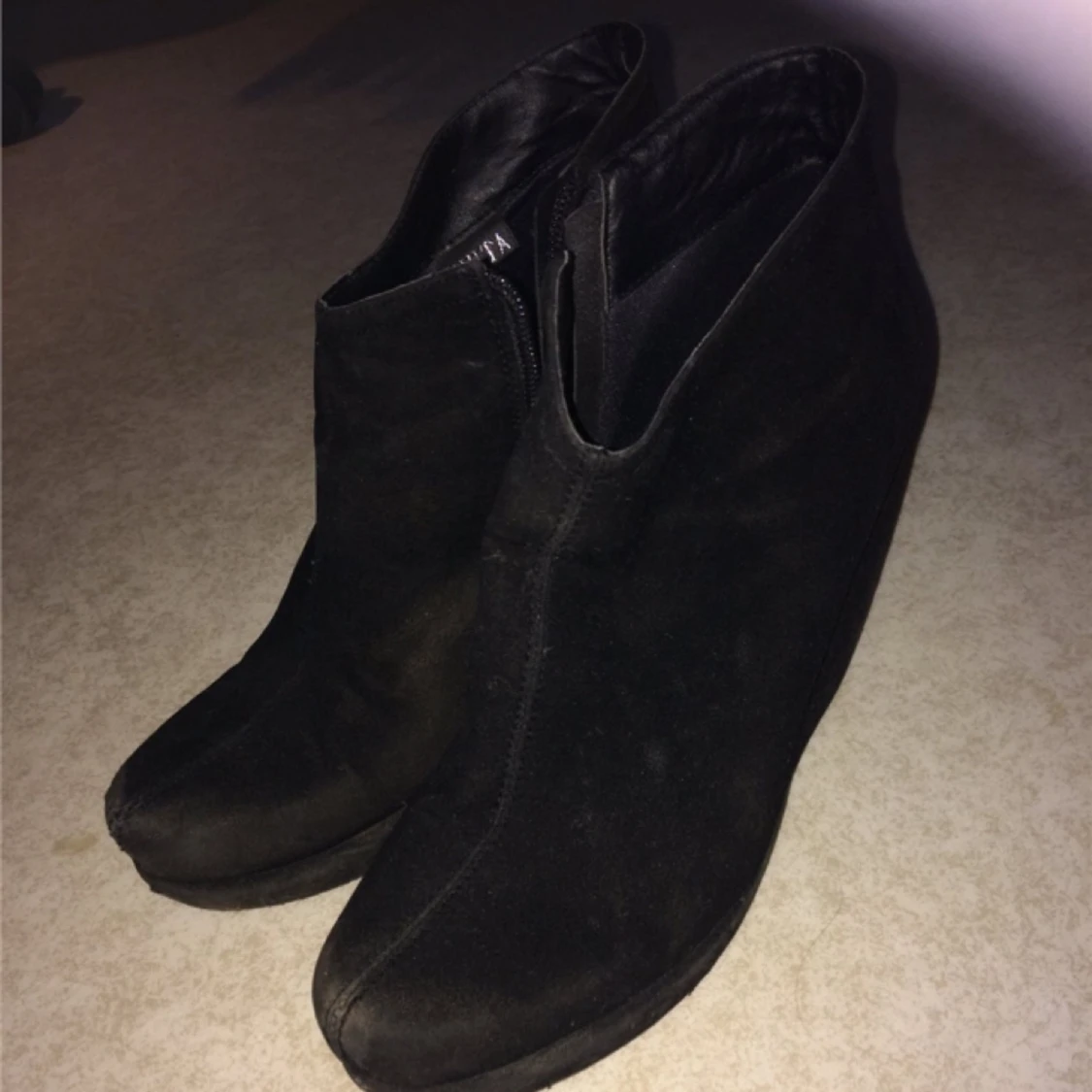 Svarta stövlar i mocka med klack - Säljer ett par svarta stövlar i mjuk mocka med spetsig tå och låg klack. Stövlarna har en dekorativ guldfärgad detalj upptill och dragkedja på ena sidan för enkel påtagning. Perfekta för att lyfta din outfit under höst och vinter.  Säljs inte längre