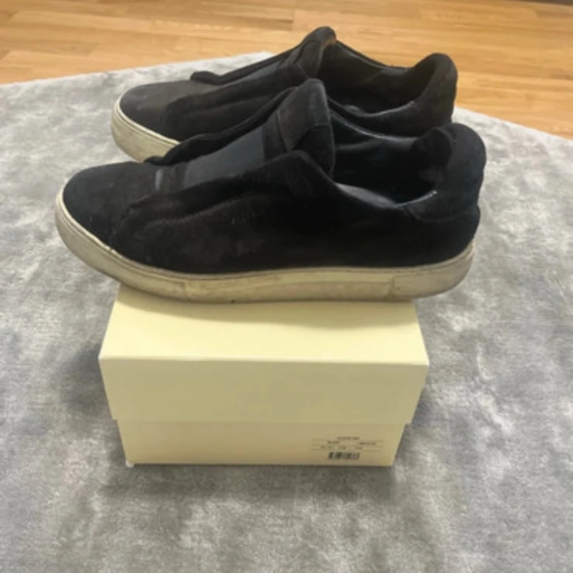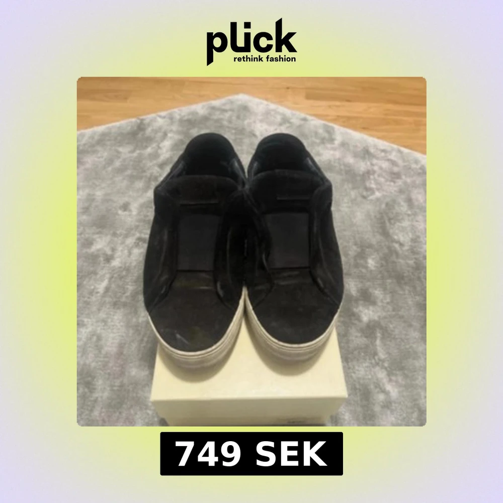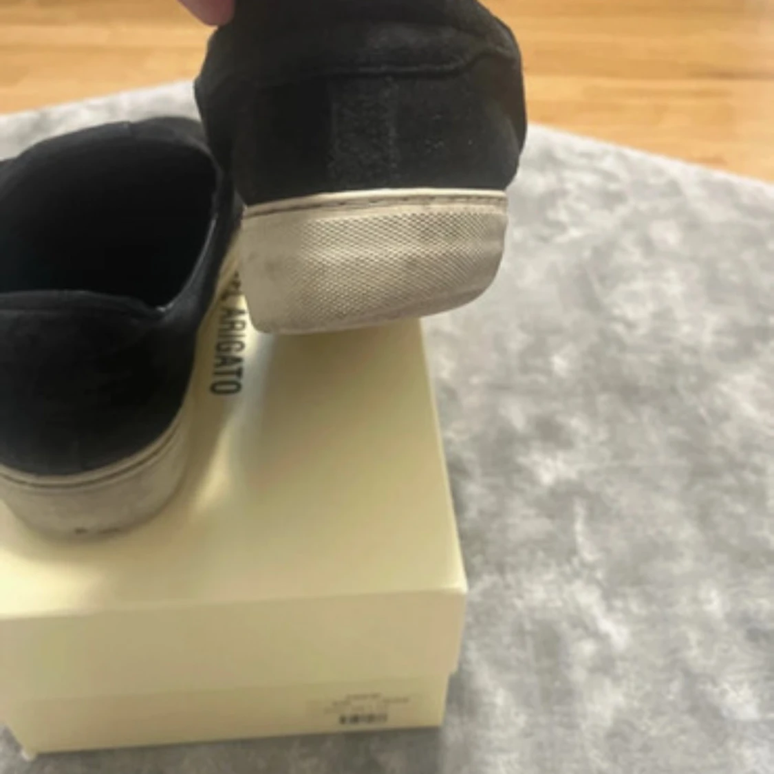 Säljer ett par svarta sneakers från Axel Arigato med platt vit sula och rund tå. Skorna är tillverkade i mocka och har en stilren slip-on design utan snörning. Perfekta för dig som gillar minimalistisk och clean streetstil. Lite sne sula men annars bra skor, samt lite hål i hälen på insidan som de blir med alla skor, inte under sulan utan inuti men inget som märks eller speciellt syns!