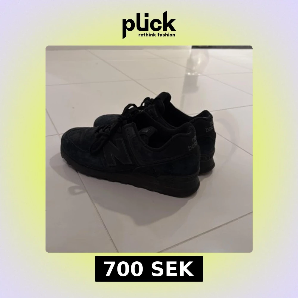 Säljer ett par helsvarta New Balance 574 sneakers i mocka och syntet. Klassisk modell med rund tå, platt sula och snörning. Diskret logga på sidan och bak, perfekt för dig som gillar stilrena och sportiga skor.