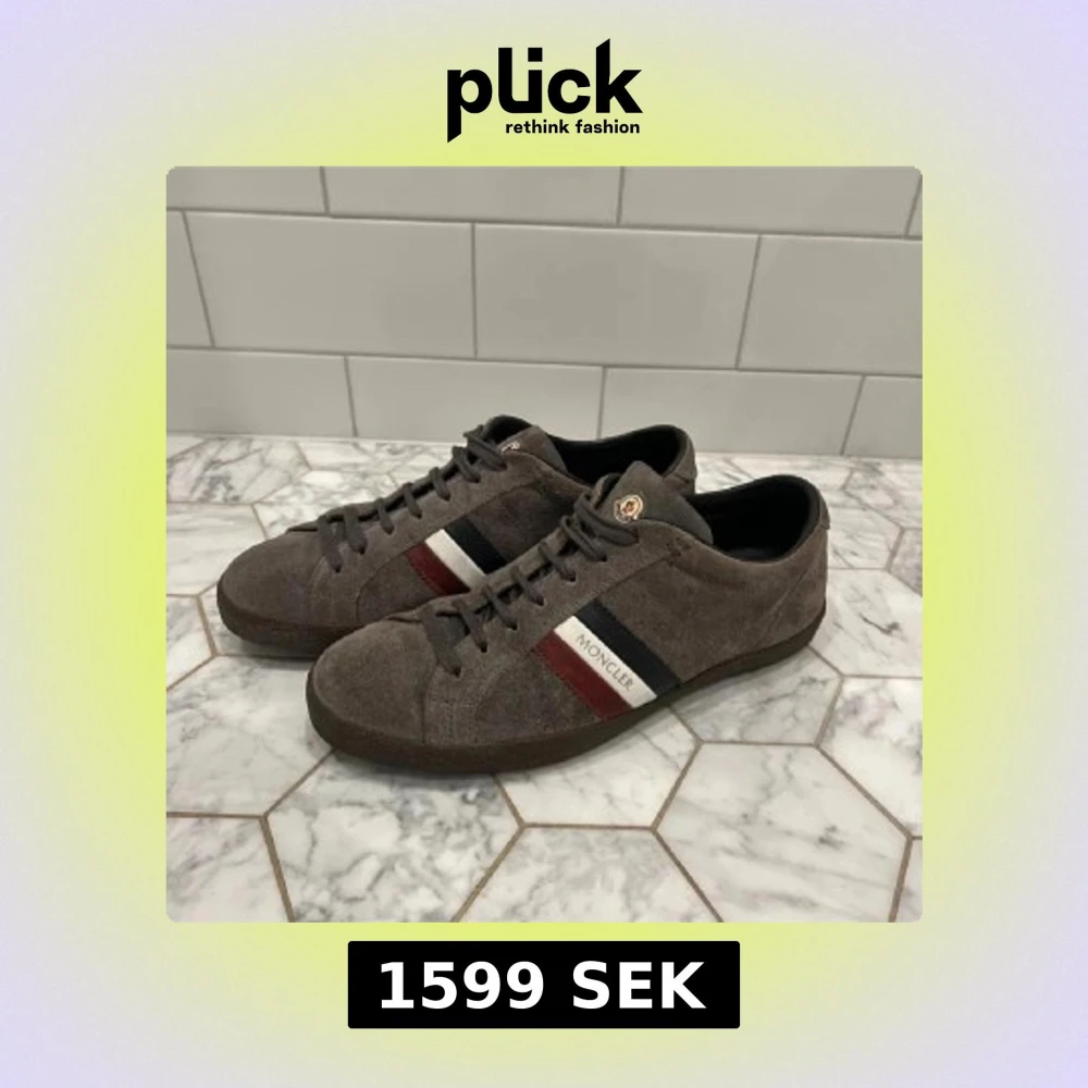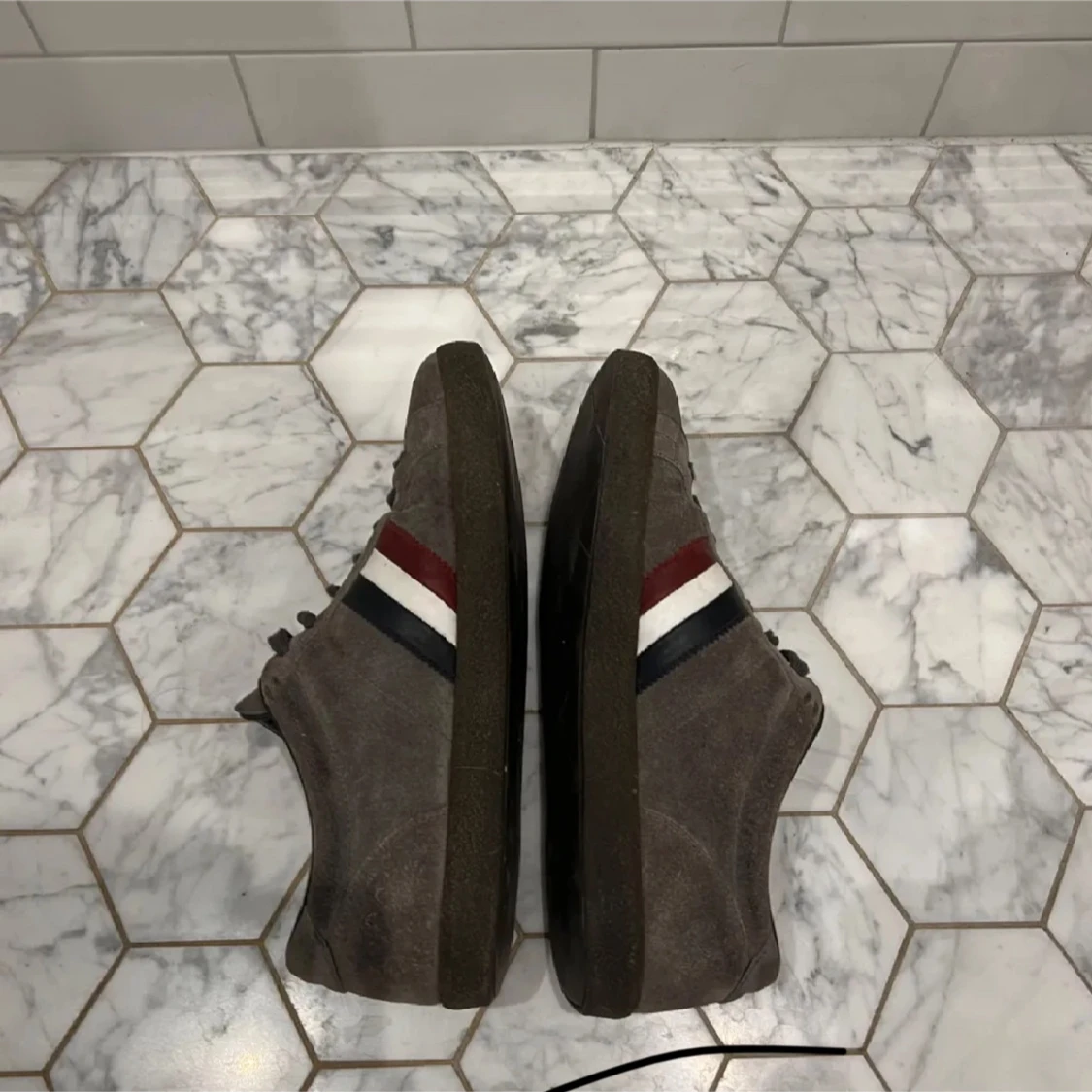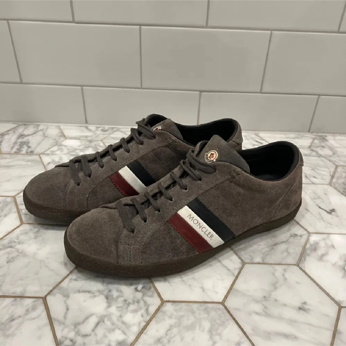 Snygga grå sneakers från Moncler i mocka med klassiska ränder i rött, vitt och blått på sidan. Skorna har snörning och en rund tå, perfekt för en stilren look.