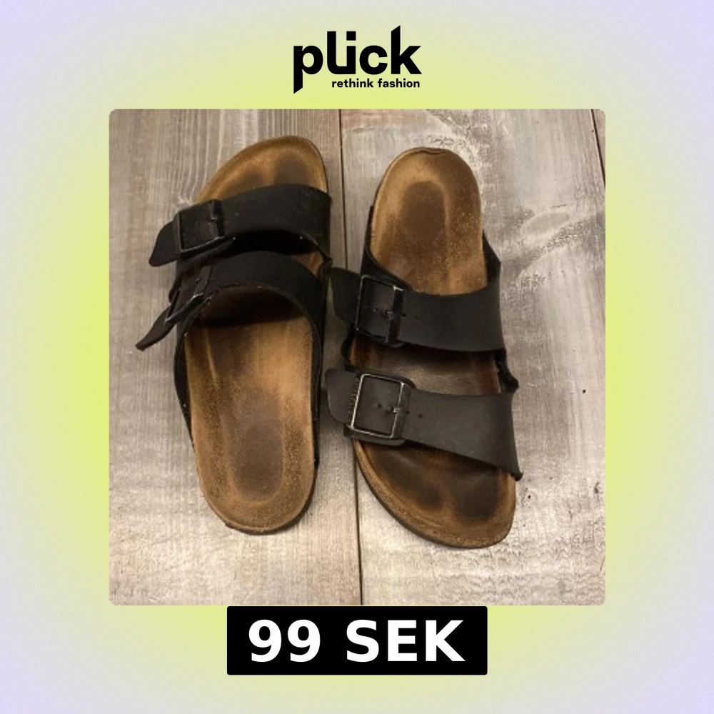 Säljer ett par svarta sandaler med dubbla justerbara spännen. De har en bekväm fotbädd och är perfekta för avslappnade dagar.