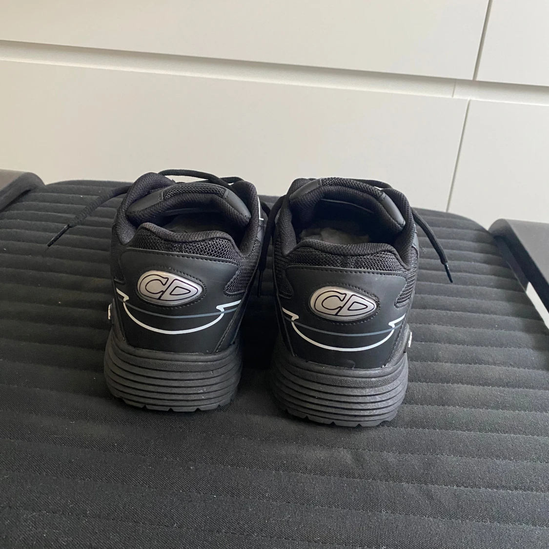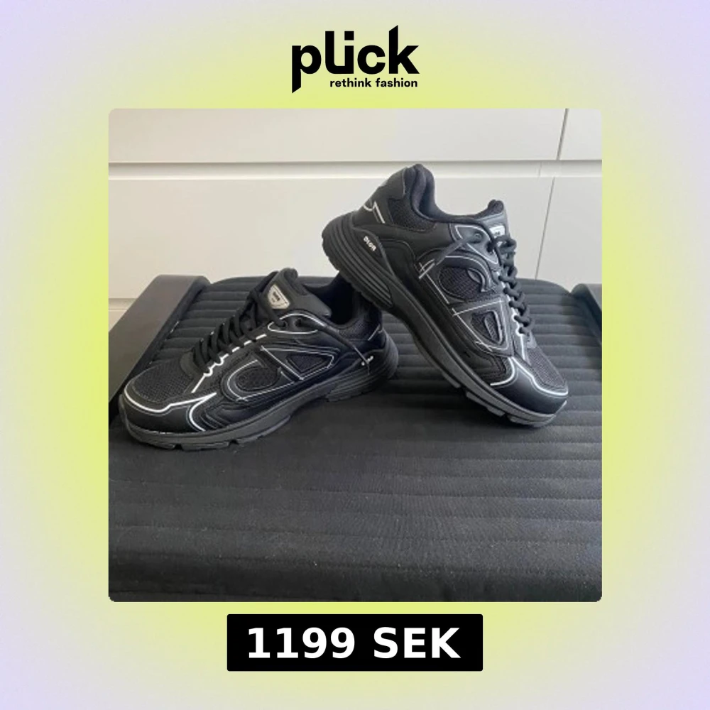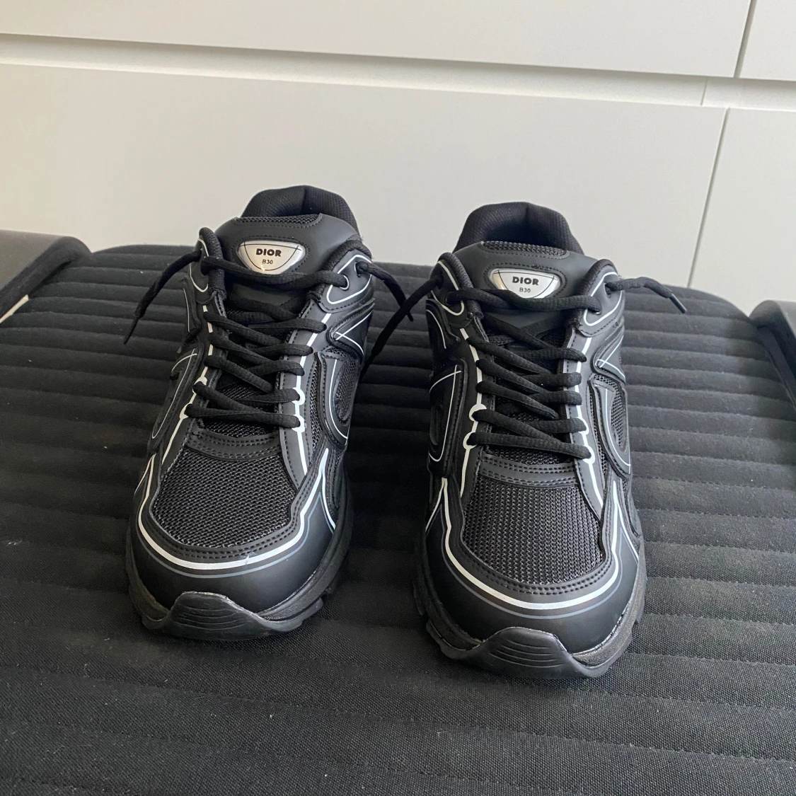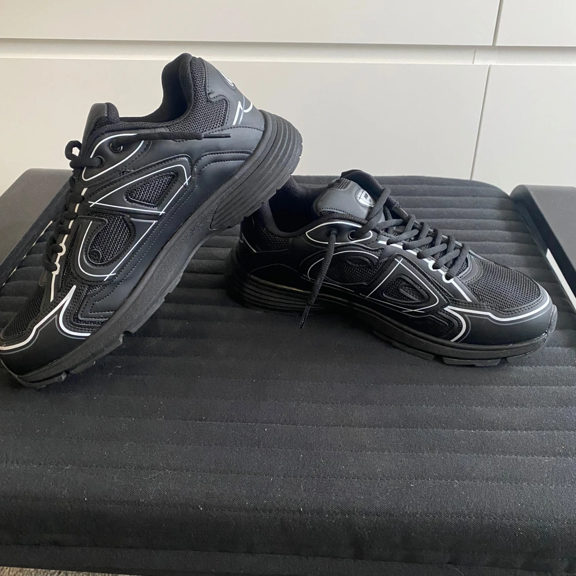 Säljer ett par svarta sneakers med vita kontrastdetaljer och meshpaneler. Skorna har rund tå, snörning och tjock sula för en sportig vibe. Märkeslogga syns både fram och bak. Perfekta för dig som vill sticka ut med lyxig streetstyle. Låda medföljer tyvärr inte!