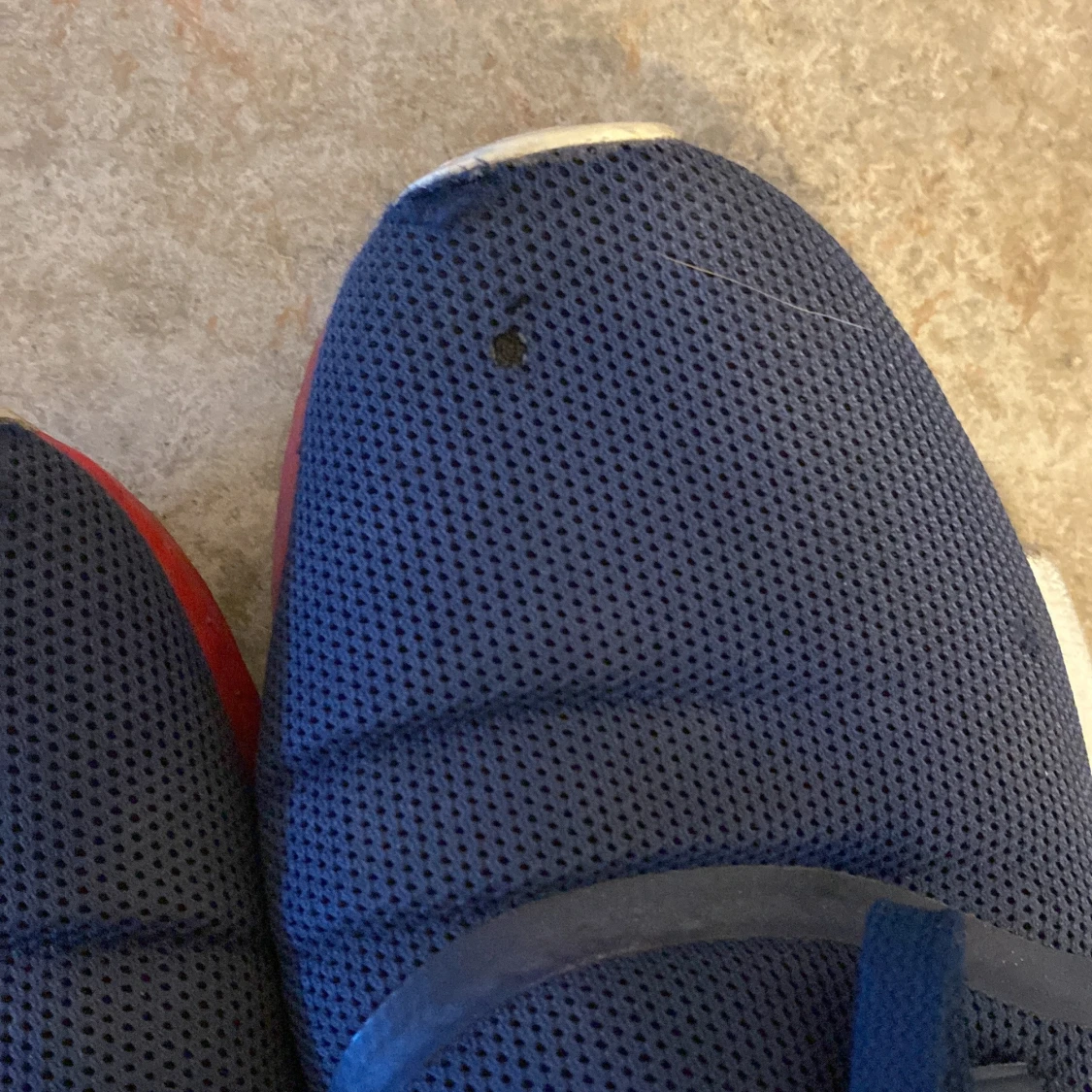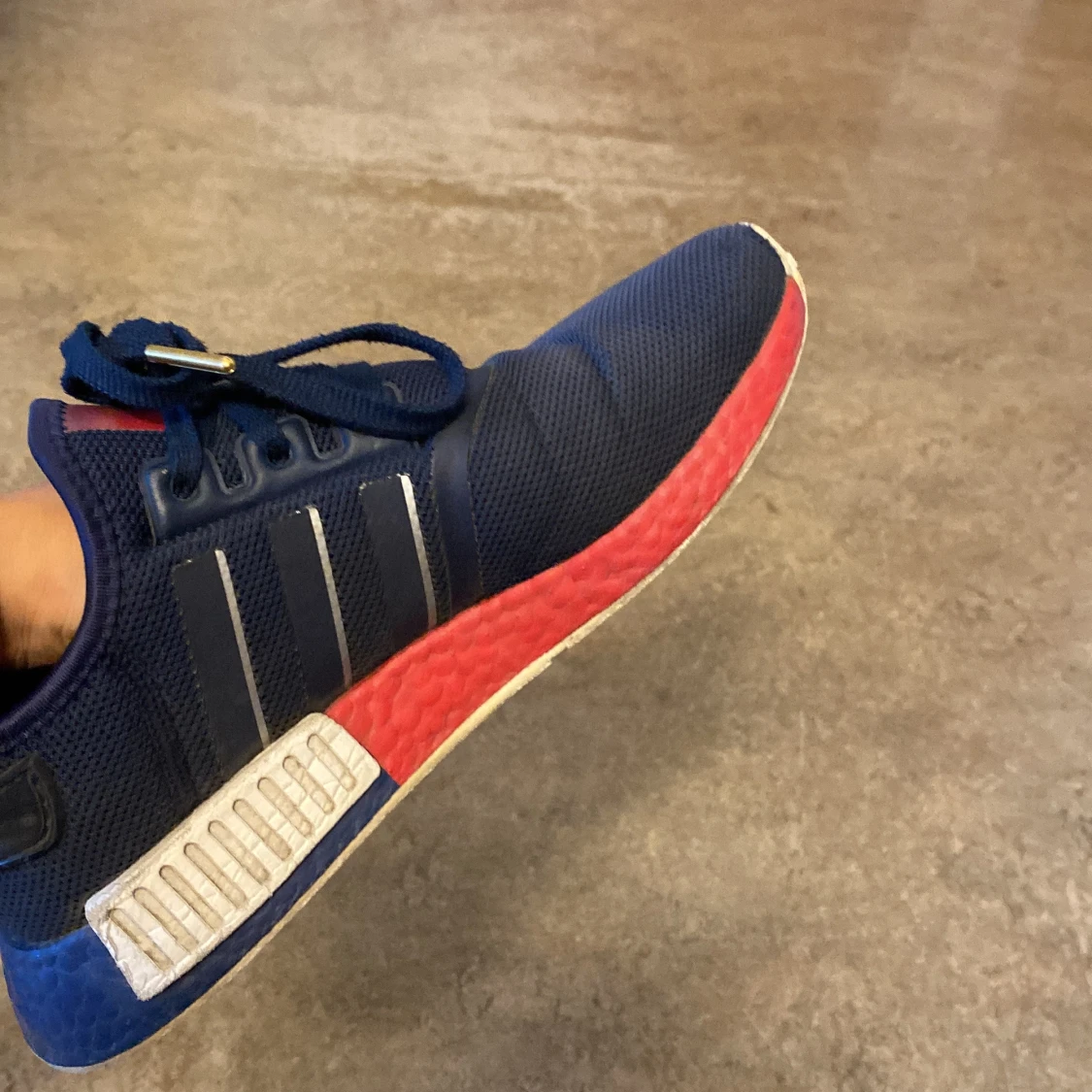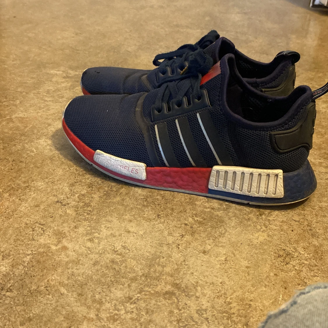 Säljer ett par Adidas NMD R1 sneakers i marinblått med röda och vita detaljer på sulan. Skorna har klassiska tre ränder på sidan, snörning och mesh-ovandel för extra komfort. Perfekta för dig som gillar streetwear och sportig stil. Defekt men inget som man tänker på