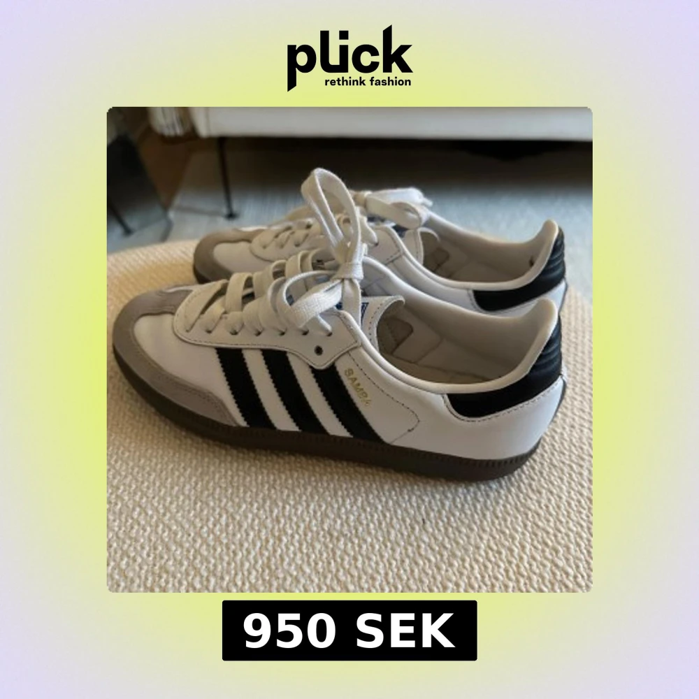 Klassiska Adidas Samba sneakers med vit ovandel, grå mockadetaljer och svarta ränder på sidorna. Perfekta för en sportig och stilren look. Storlek 36 2/3 - passar mig med 37. Använda 2-3 gånger och inköpta förra året. 🖤