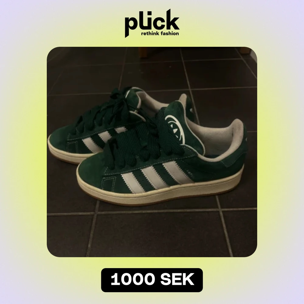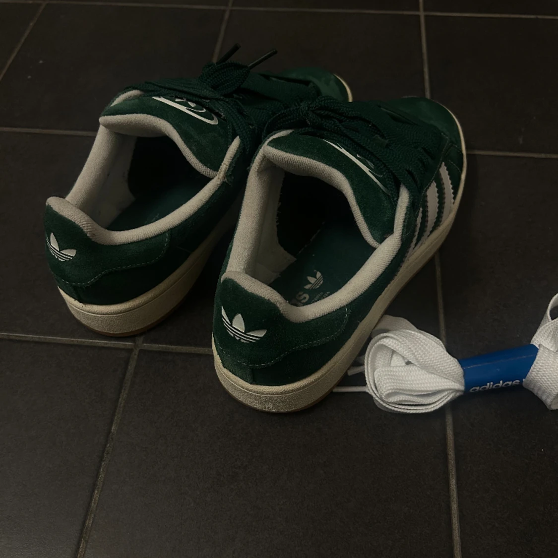 Adidas campus 00 i färgen grön. Slutsåld överallt, använd 2 gånger men säljer då de var för stora för mig. Knappt använda och de oanvända vita skosnörena får man till. Är i storlek 40 2/3 men passar alla mellan 39,5-41.