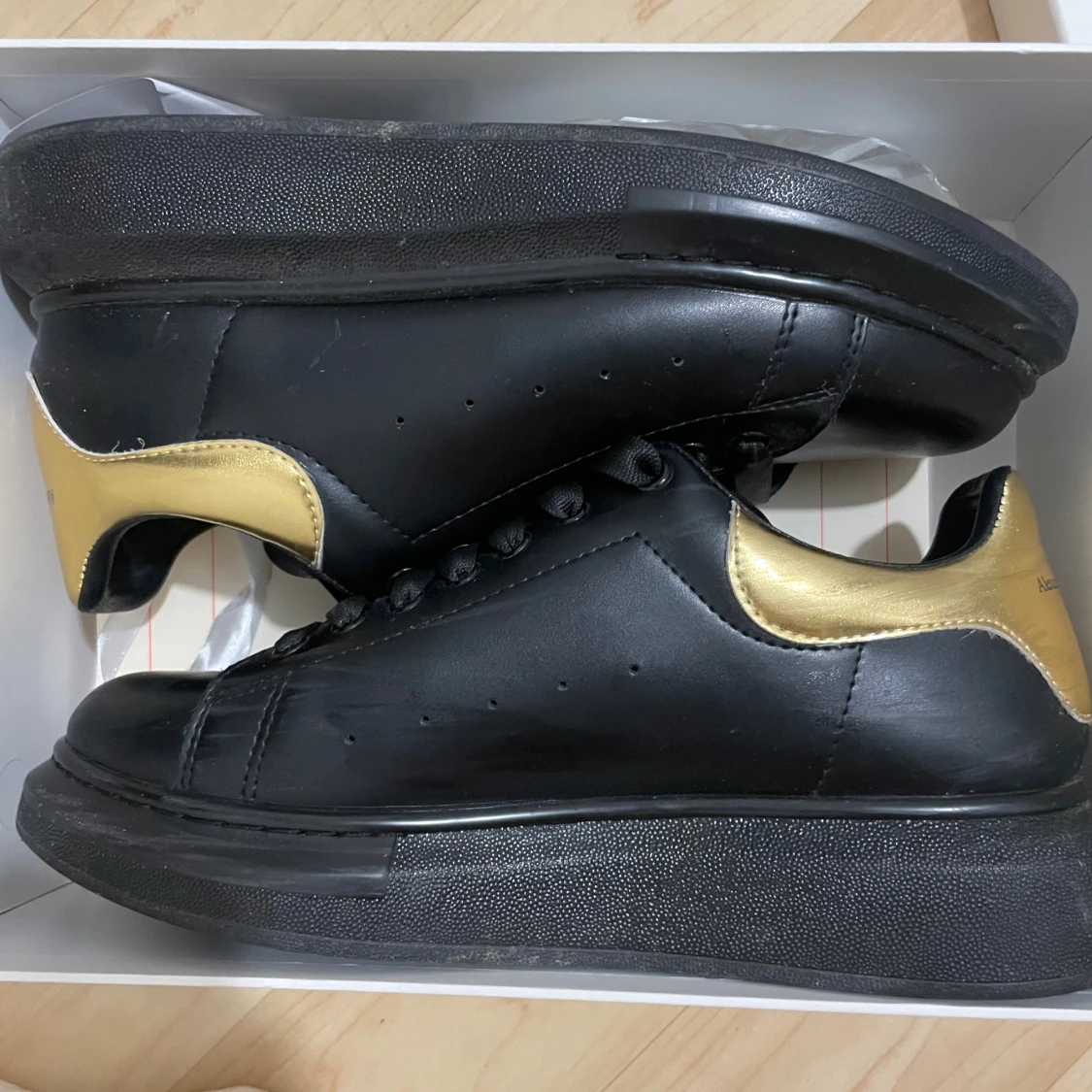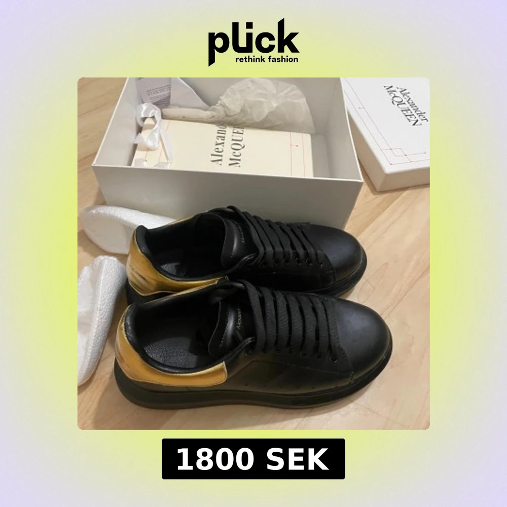 Snygga svarta sneakers från Alexander McQueen med metallicguld detalj på hälen. Skorna har platt sula, rund tå och klassisk snörning. Tillverkade i skinn med en chunky siluett som ger en cool och modern vibe. Perfekta för dig som gillar statement-skor.