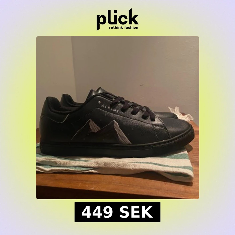 Svarta sneakers från Alpine med coolt bergmotiv på sidan och en liten skidåkare på hälen. Skorna har snörning, rund tå och är gjorda i skinnliknande material. Röd Alpine-logga på plösen och vita detaljer längs sömmarna ger en snygg kontrast. Asskön sula och perfekta för is och slask.
