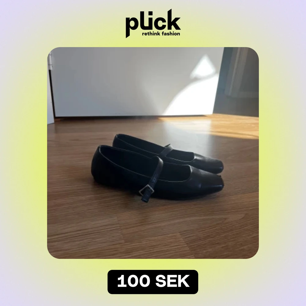 Säljer ett par stilrena svarta ballerinaskor med en elegant rem över foten. Skorna har en fyrkantig tå och är perfekta för både vardag och fest. De är i bra skick och redo för en ny ägare! Använda 1 gång. nypris: 289