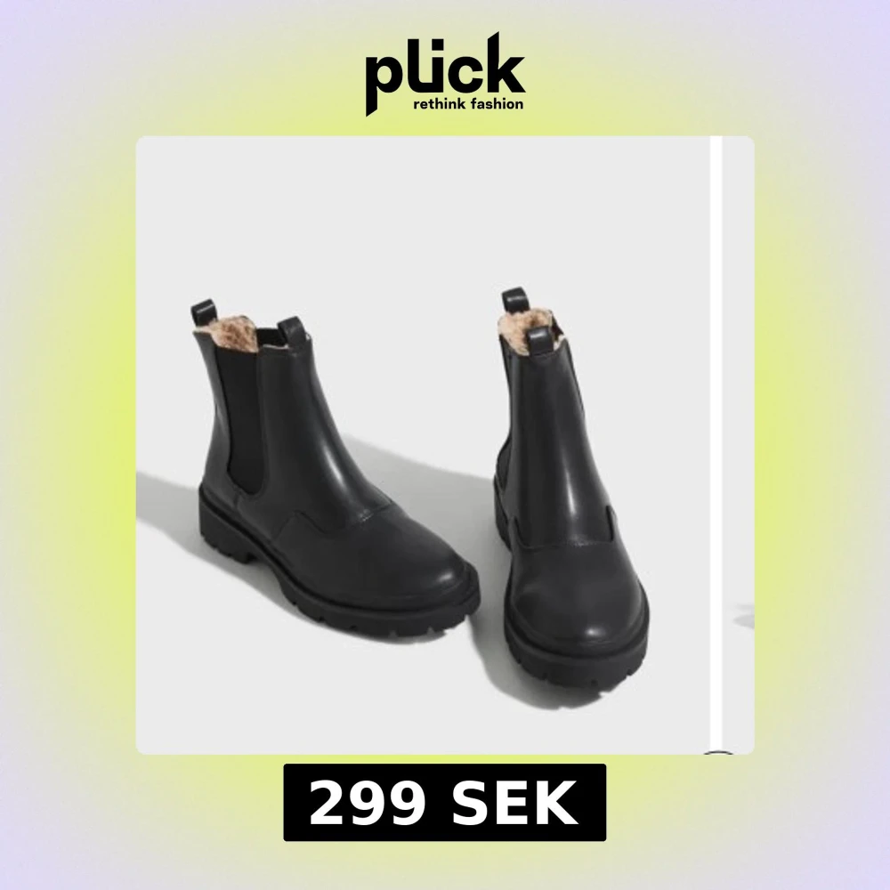 Säljer ett par svarta Nelly boots med chunky platt sula och rund tå. Bootsens insida är fodrad med beige päls för extra värme. Utsidan är i skinn och har elastiska paneler på sidorna samt dragflikar upptill. Perfekta för kalla dagar och riktigt snygga till jeans.