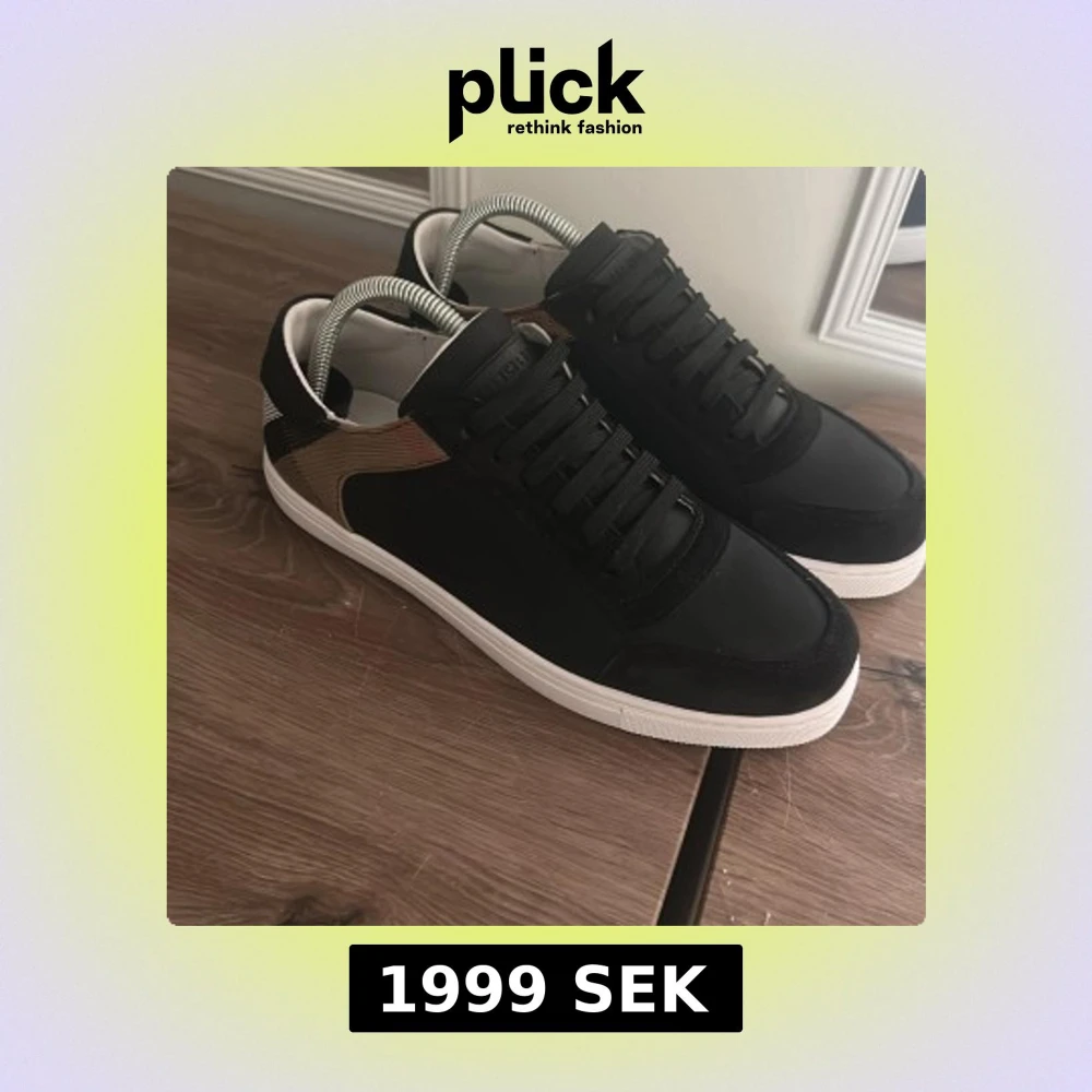 Snygga svarta sneakers från Burberry med klassiska beige och svarta rutiga detaljer på hälen. Skorna har vit platt sula och svarta snören. Perfekta för dig som vill ha en stilren men ändå unik look.