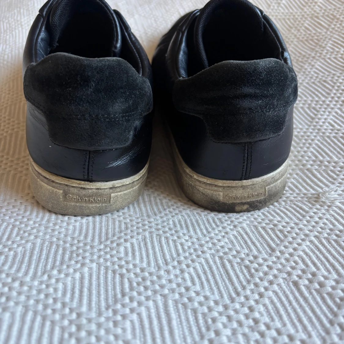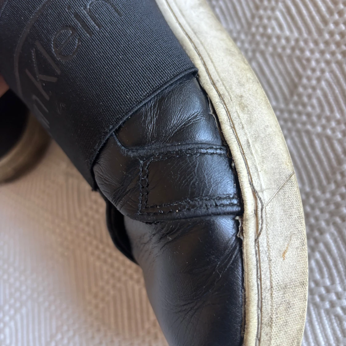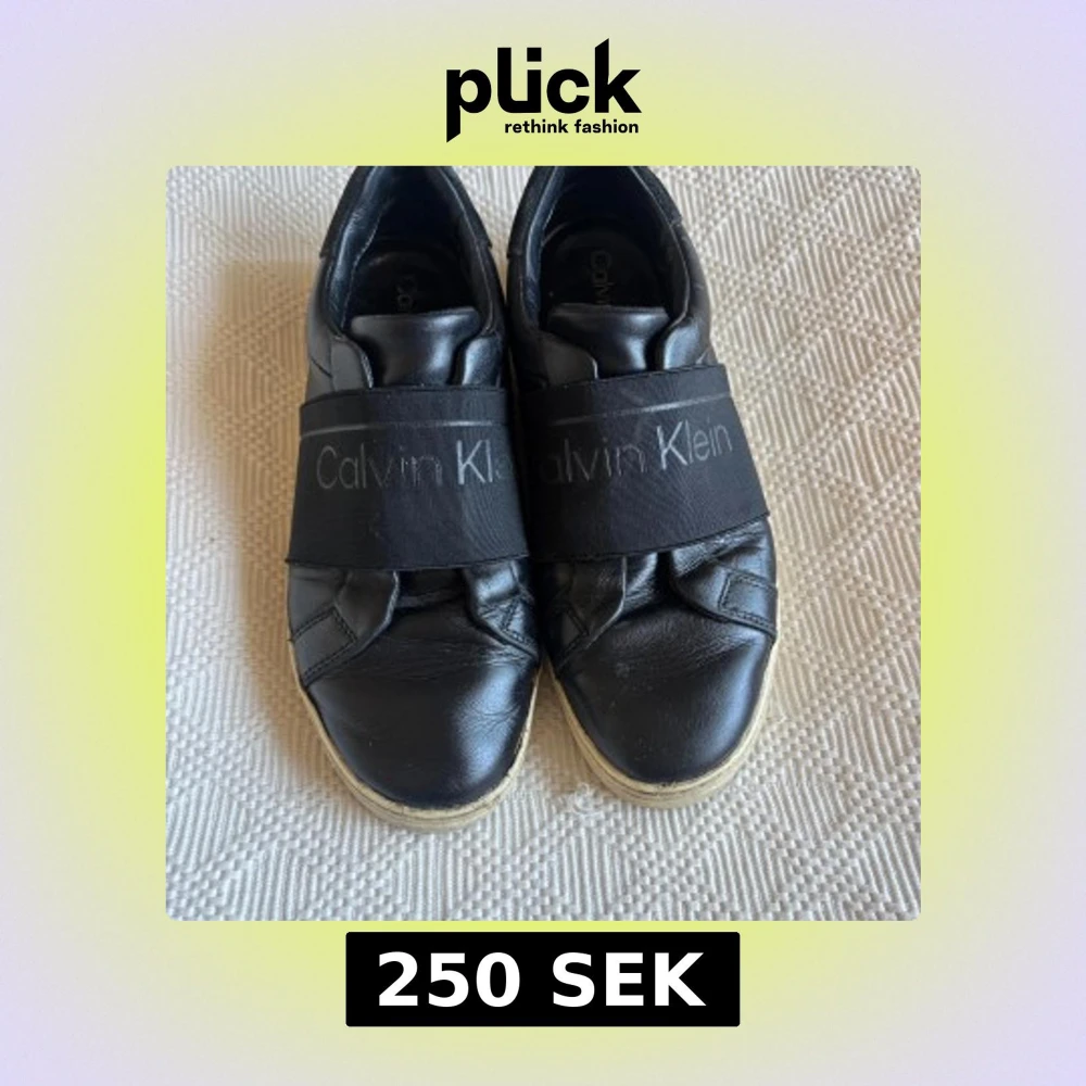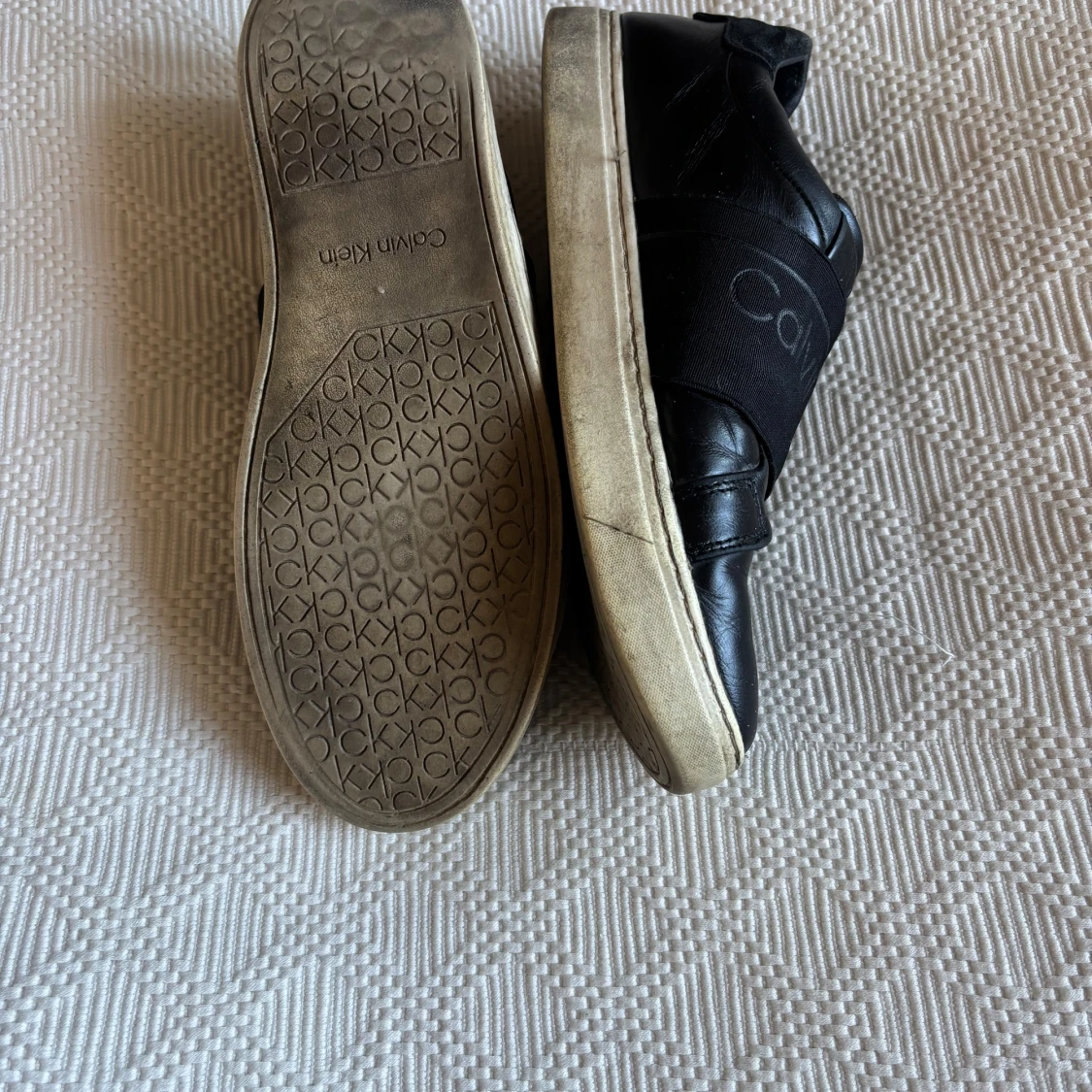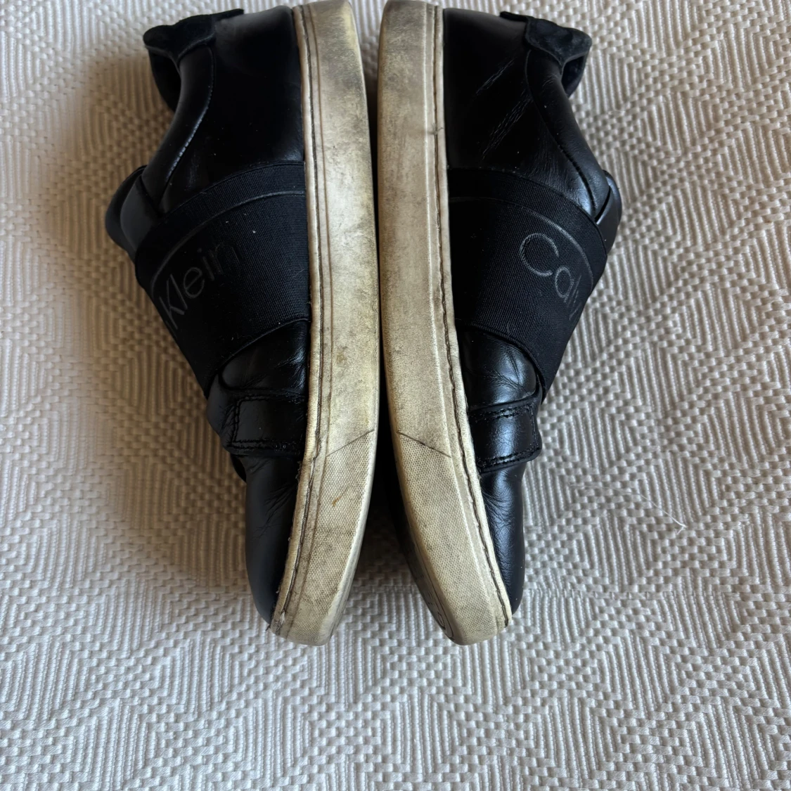 Svarta sneakers från Calvin Klein med bred elastisk rem över foten med logotyp. Ovandel i skinn och mockadetalj vid hälen, samt vit platt sula med CK-mönster undertill. Snygg och stilren design som passar till jeans och hoodie.
