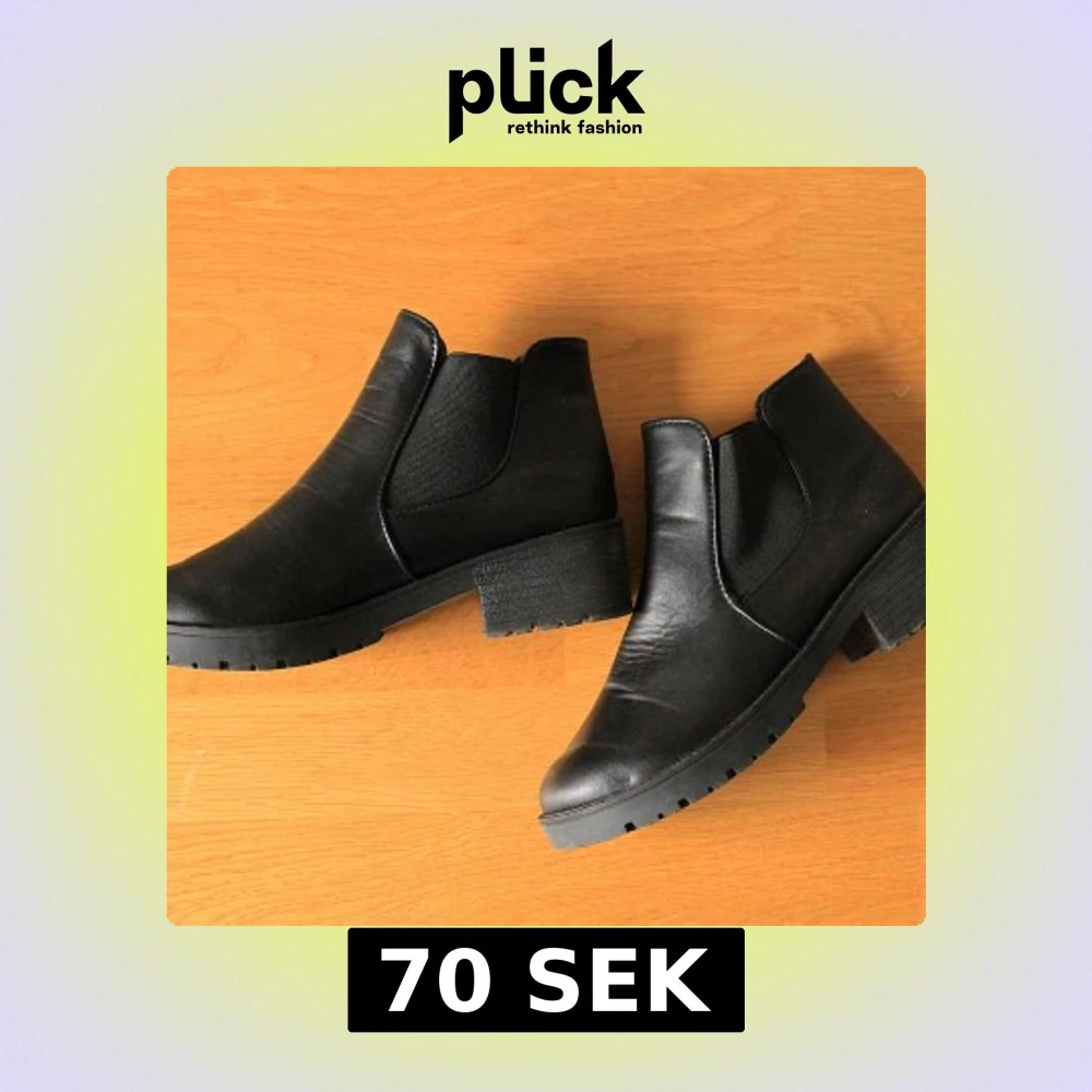 Svarta chelsea boots i skinnimitation med låg klack och rund tå. Perfekta för dig som vill ha en stilren och klassisk look. Använda ett fåtal gånger.