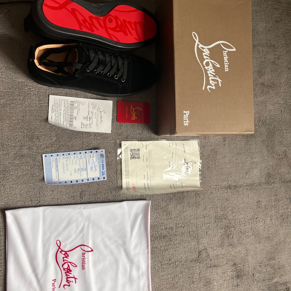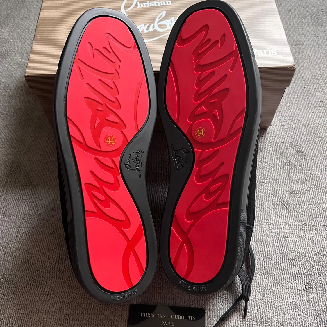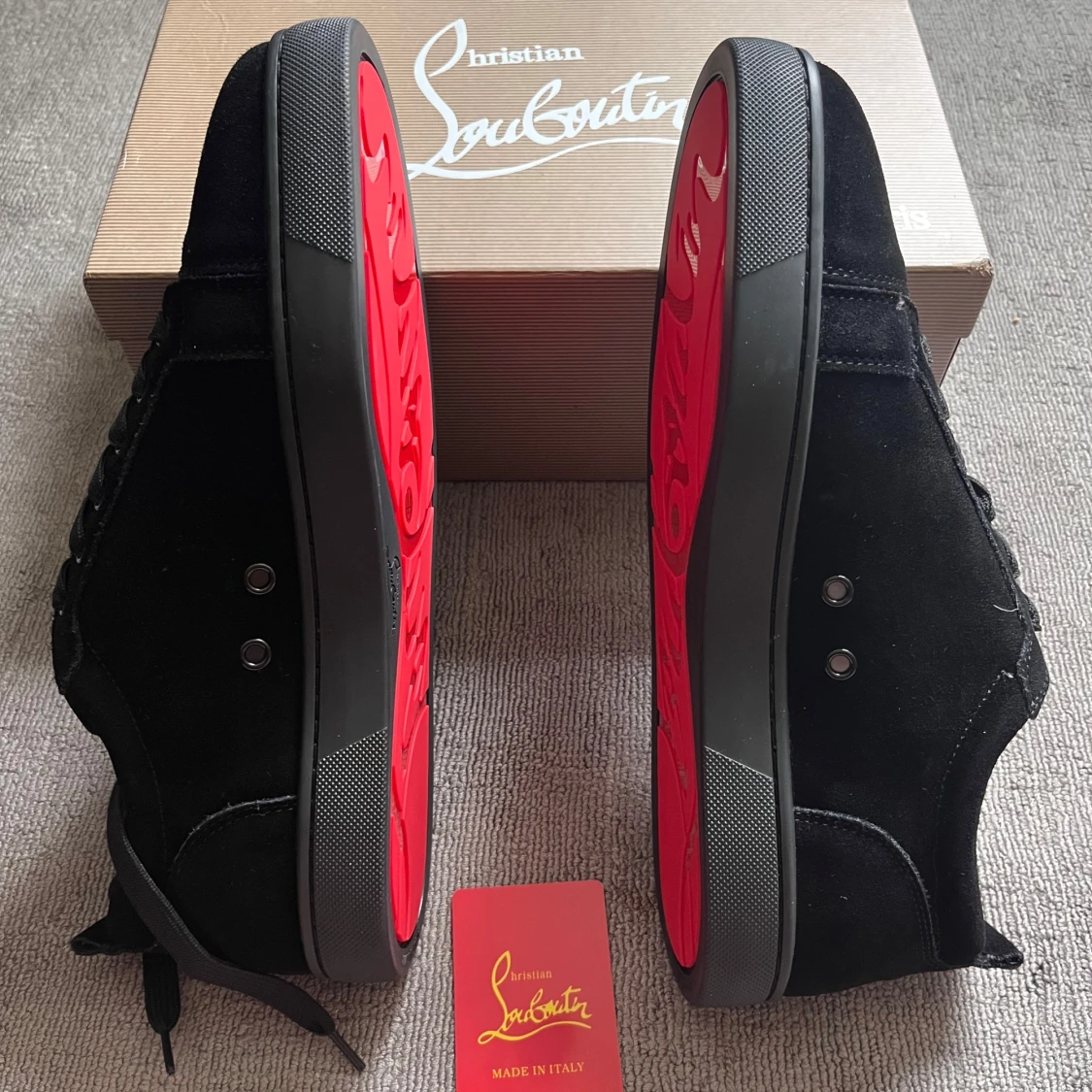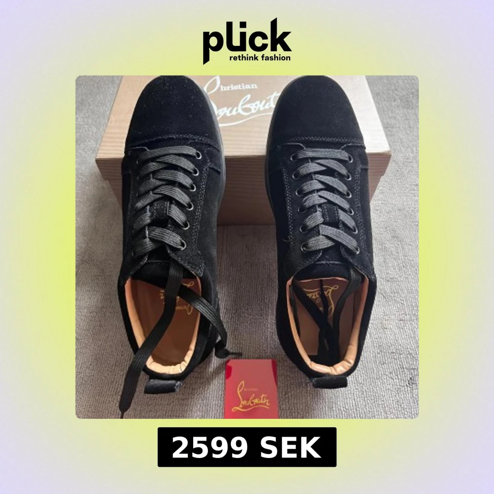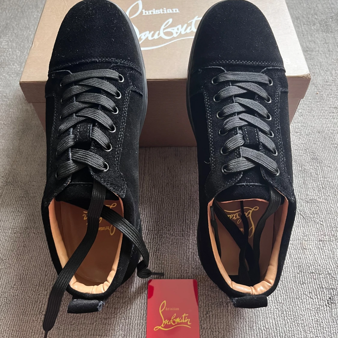 Exklusiva svarta skor från Christian Louboutin i mjuk mocka med klassiska röda sulor och svarta snören. Snygg och stilren design med rund tå och diskreta metalldetaljer på sidan. Perfekta för dig som vill sticka ut med lyxig streetstyle. Allt i bilden medföljer