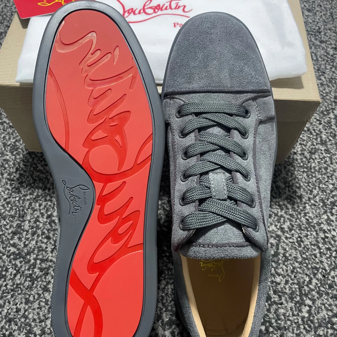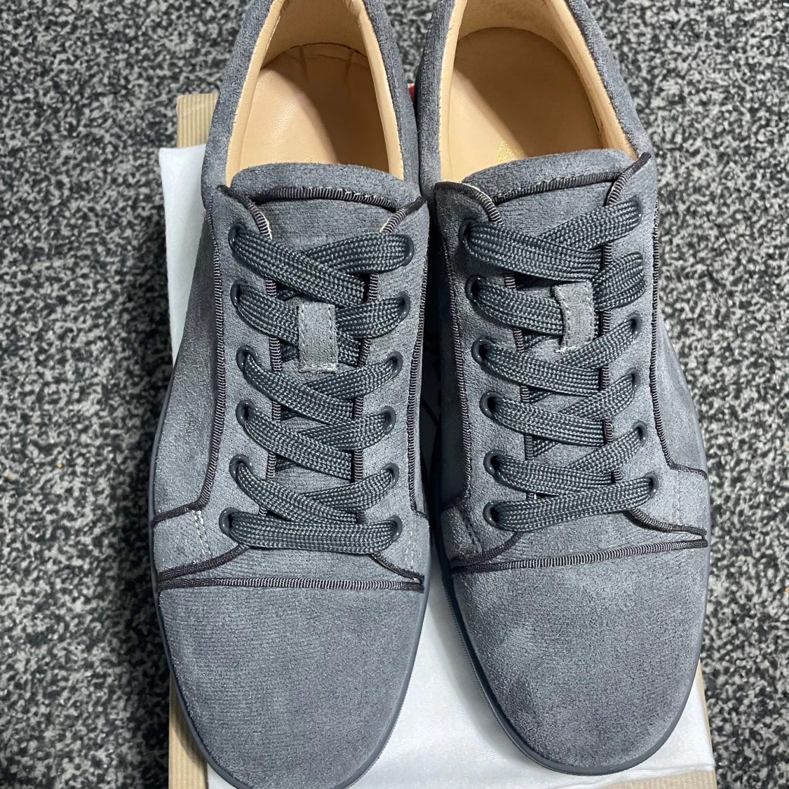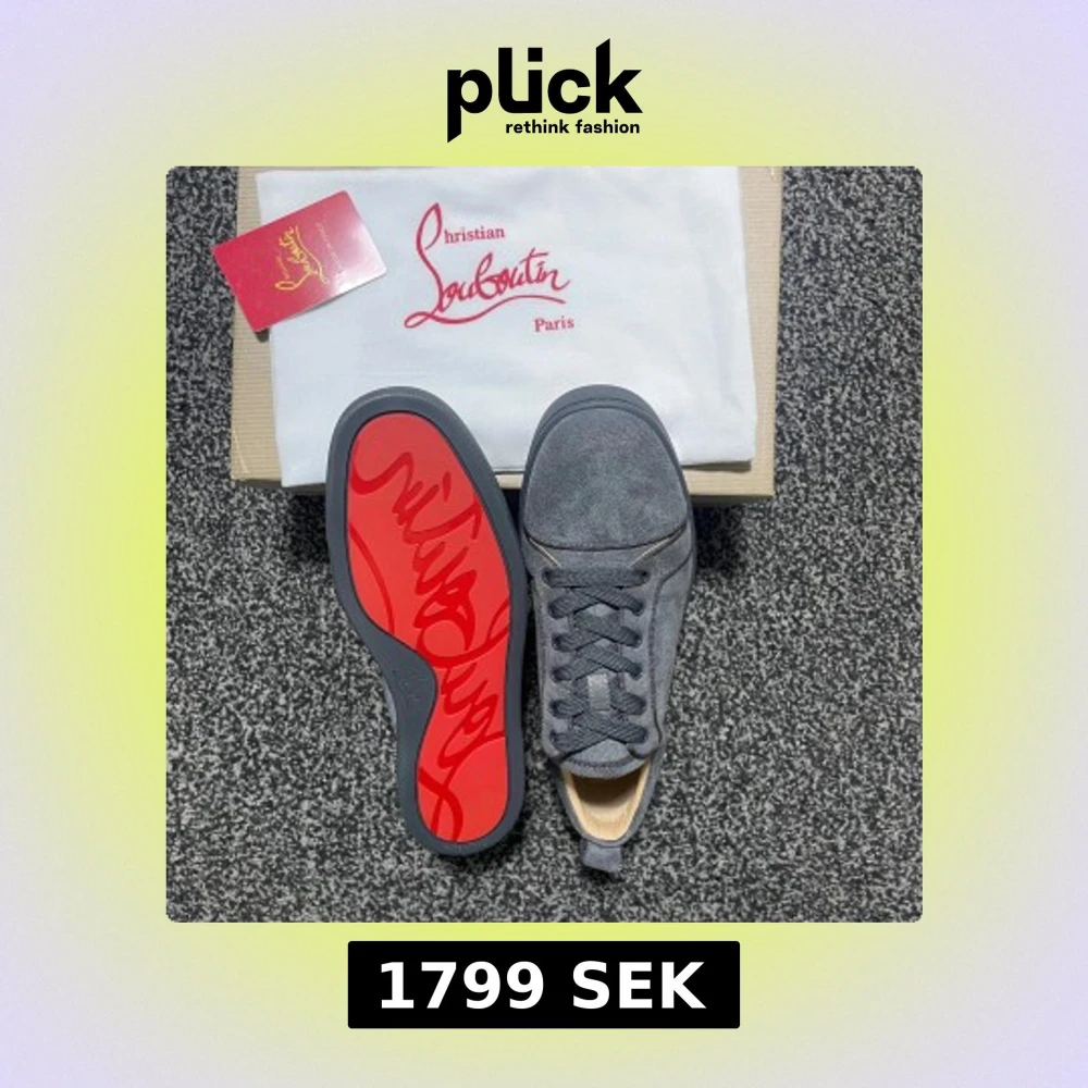 Snygga grå sneakers i mocka från blish med den ikoniska röda sulan. Skorna har snörning och en stilren design som passar perfekt för en trendig look.