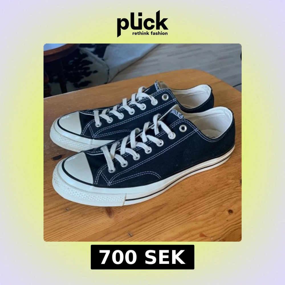 Klassiska svarta Converse Chuck Taylor All Star sneakers med vit tå och sula. Skorna har snörning, vita sömmar och låg modell. Perfekta för en avslappnad och tidlös stil. Använda vid ett tillfälle. Converse 10,5 = strl 45 skulle jag säga