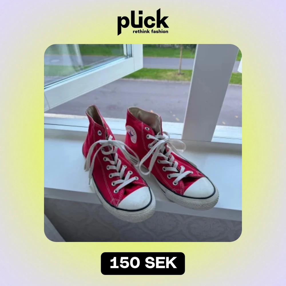 Säljer ett par klassiska röda Converse All Star sneakers i storlek 39. Skorna är i bra skick med vita snören och den ikoniska vita gummisulan. Perfekta för både vardag och fest!