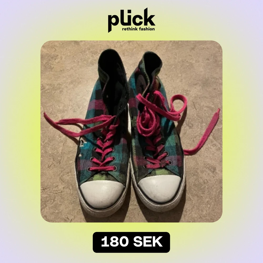 Snygga ÄKTA vintage Converse med rutigt mönster. Ett par hål från skejtandet, dock bara i de översta två lagren av skon. Innersulor fattas. Skorna är i storlek 42.5 men sitter snarare som 41.5!