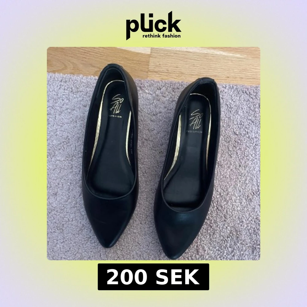 Stilrena svarta pumps från dinsko med spetsig tå och låg klack. Skorna är gjorda i syntetmaterial och har en klassisk, minimalistisk design med en liten guldfärgad detalj bak. Perfekta för dig som gillar en clean look med lite edge. Använda 1 gång