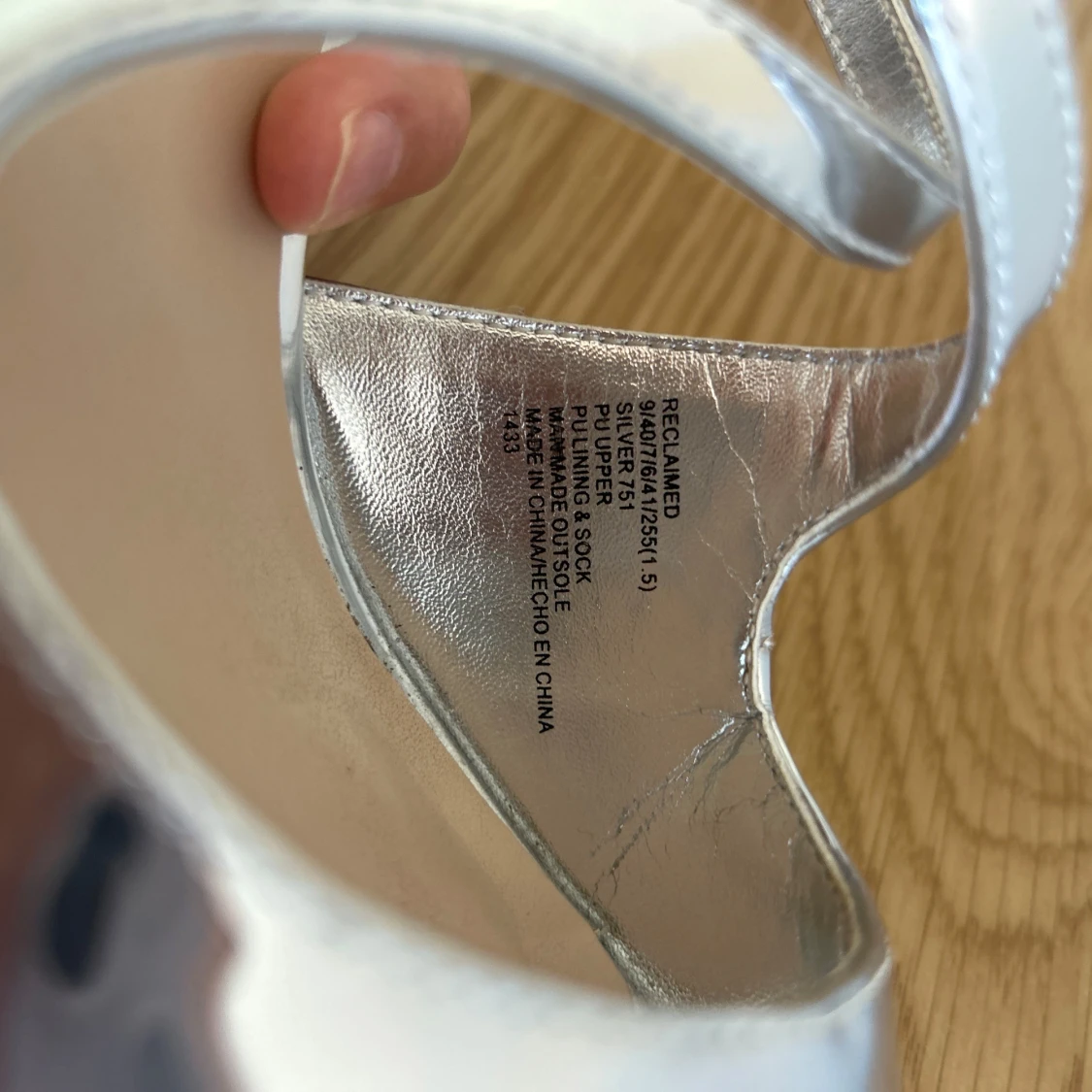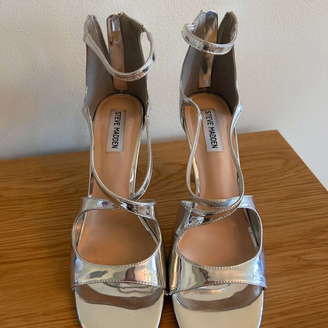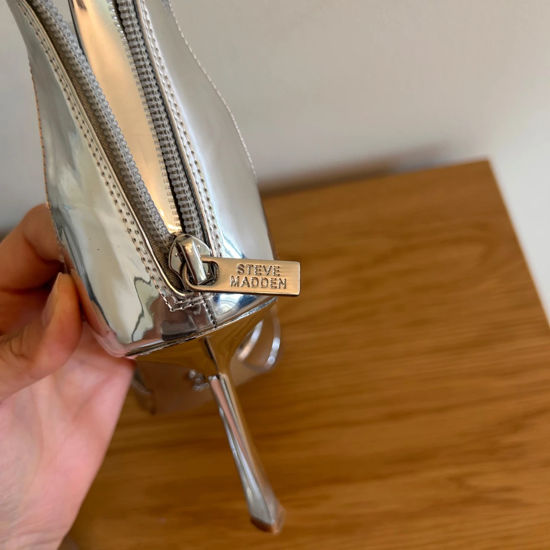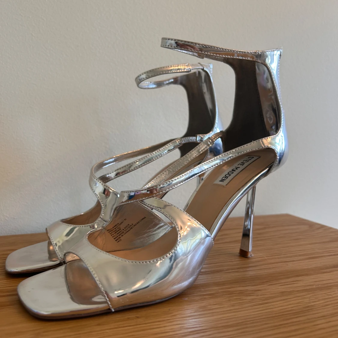 Snygga pumps från Steve Madden i metallic silver med höga klackar och öppen tå. Skorna har en cool dragkedja baktill och smala remmar som korsar foten. Tillverkade i syntetmaterial med en glansig finish och fyrkantig tå. Perfekta för att sticka ut med en futuristisk vibe.