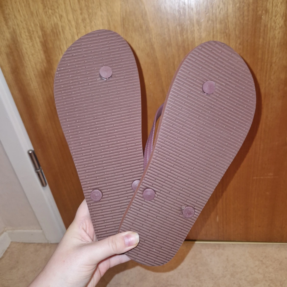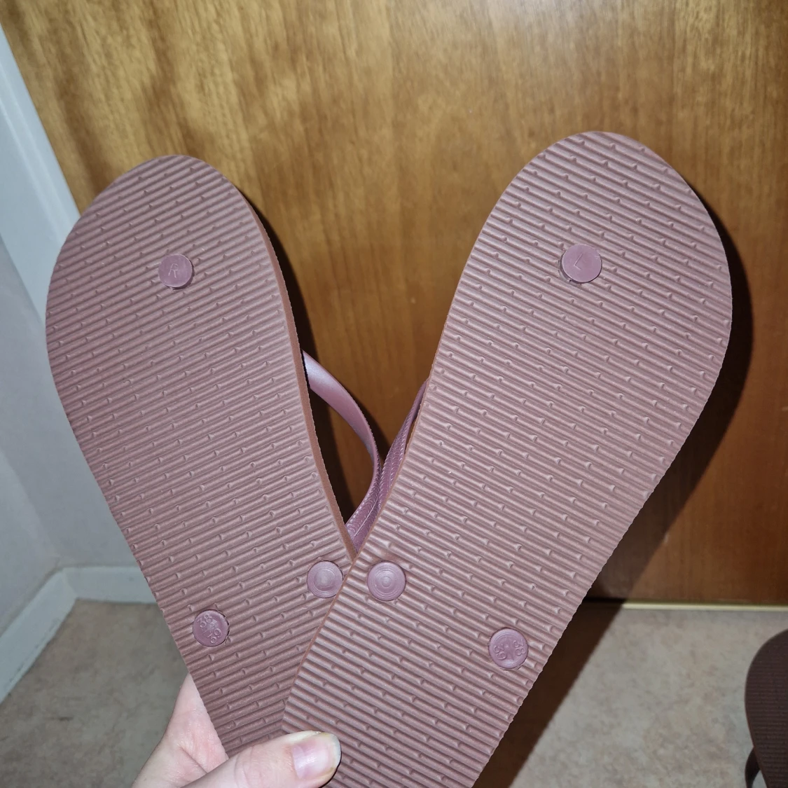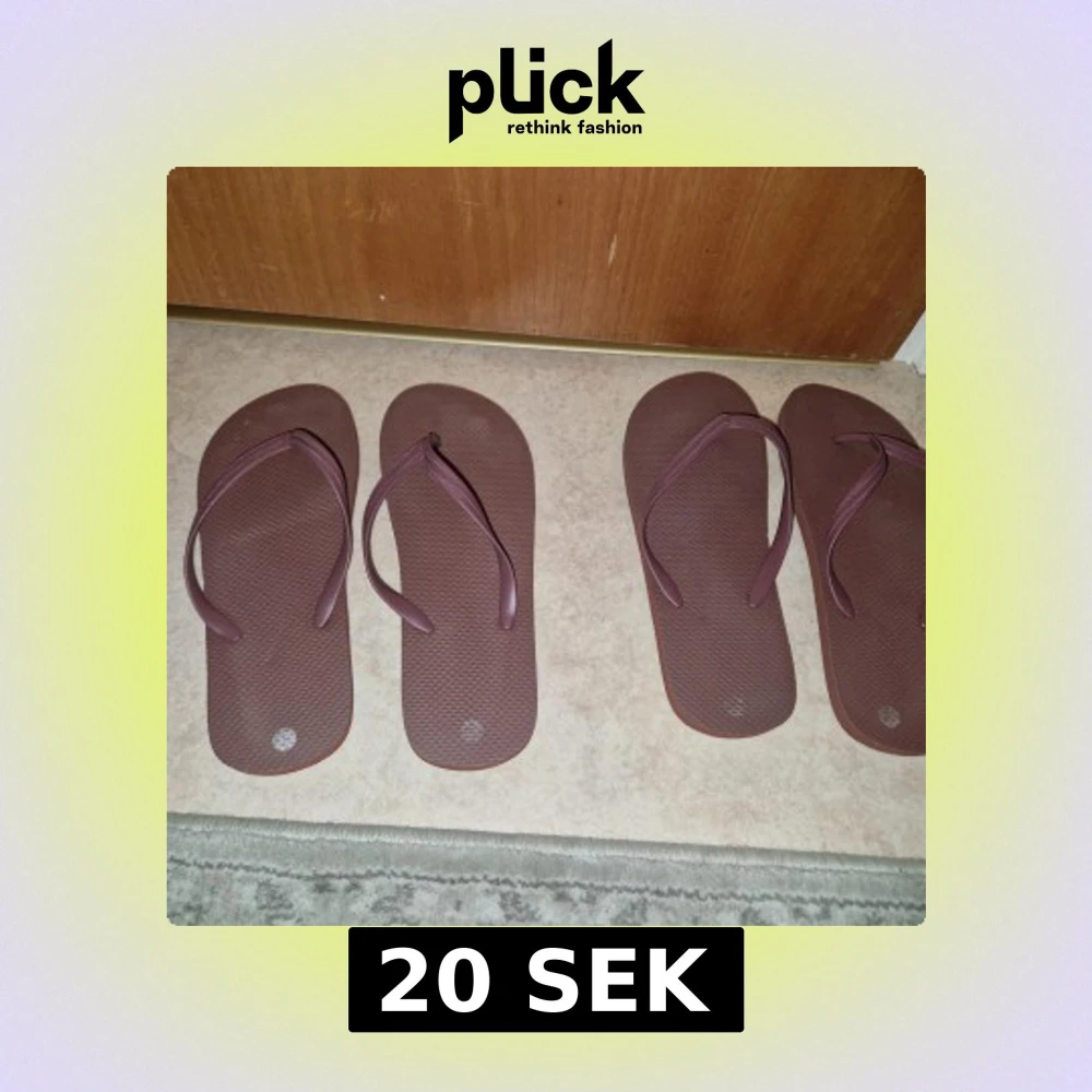 Säljer två par bruna flip-flops med klassisk design. De har en enkel rem och platt sula, perfekta för varma dagar. Tillverkade i syntetmaterial och passar lika bra till stranden som till chill hemma. Enbart använda 1h inomhus. Priset är för båda paren men kan absolut köpas separata! Passar storlek 38 och 39