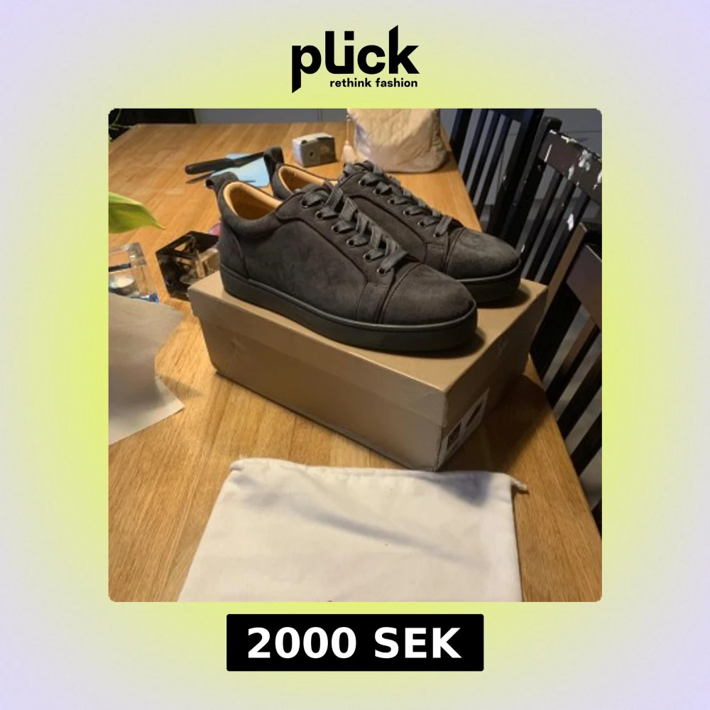 Snygga grå sneakers i mocka från Christian Louboutin med den ikoniska röda sulan. Skorna har snörning och en stilren design som passar perfekt för en trendig look. Skriv priv om frågor eller annat!