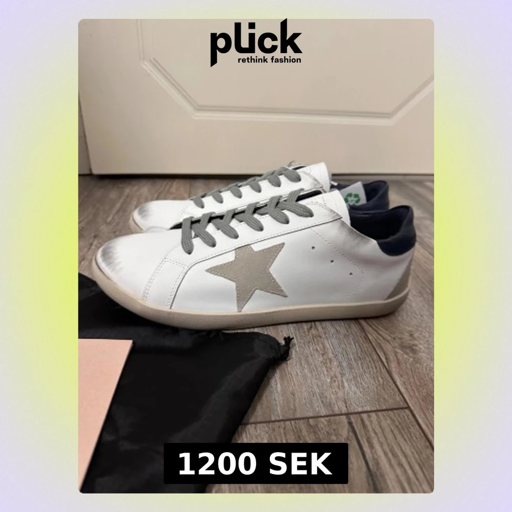 Golden Goose Superstar sneakers i vitt skinn med grå mockastjärna på sidan, grå snörning och mörkblå häl. Platt sula och rund tå. Snyggt slitna detaljer på tå och sula för en cool look. Kommer med originalpåse och pass.