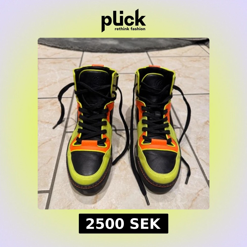 Säljer ett par unika och neon skor från Gucci. Skorna har en iögonfallande kombination av svart, orange och gul med snörning och hög modell. Perfekta för dig som vill sticka ut! Dom är både unika och svåra att hitta. Nypris är 5000kr